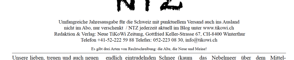 Die Jahre vergehen im Flug. Was mit AnnA’s erstem Geburtstag (und dem seither aus allen Nähten platzendem Fotoarchiv) vor 15 Jahren begann, hat seither Tradition. Unsere Weihnachtszeitung, unsere NTZ, unsere Neue Tikowi Zeitung. Sie berichtet von Schönem und Lustigem, plaudert aus dem chaotischen Nähkästchen der TiKoWis, zeigt Fotos von nah und fern und lässt uns jedes Jahr von neuem staunen, wie viel wir eigentlich erlebt haben. Und wie gross die Kinder geworden sind. Und wie breit / grau / gebückt und klapprig wir…. Und wie gut es uns geht, jawoll! Anlass dankbar zurück zu schauen, Anlass aber auch, mutig die Zukunft anzupacken und zu gestalten. Was immer sie auch bringe! bis jetzt auf jeden Fall haben die TiKoWi’s als Duo, Trio oder Quartett, mit und ohne Vierbeiner schon manche Klippe mehr oder weniger elegant umschifft, so werden wir auch in Zukunft auf die Füsse fallen.