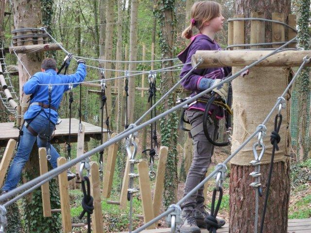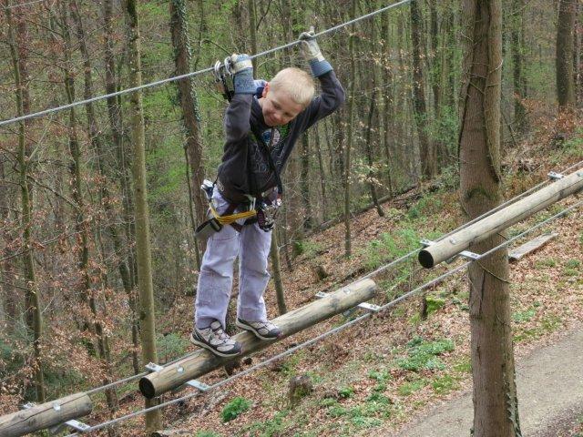 Aber wie gesagt, der Abschluss des Parcours „Swing“ (man sollte sich da einen Melkschemmel zwischen die Beine klemmen und sich dann in die Tiefe stürzen, damit man gegenüber in ein Seil schwingen kann) hat mich doch einiges an Überwindung gekostet. Auch Eric’s lapidare Bemerkung: „Mama, Du bist ein Weichei“ reichte noch nicht ganz. Ich bin dann gesprungen, aber ähm, zu zögerlich und somit hatte ich keine Chance, das Netz zu erreichen. Ups, ich hänge trotzdem nicht mehr da!