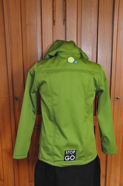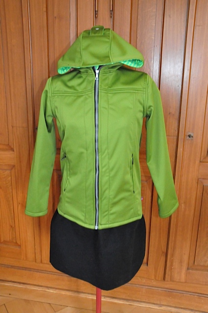Schnitt: www.farbenmix.de – Quinn, Stoff: www.stoffkiste.ch (ein Softshell der Firma Swafing, herrliche Qualität und wirklich frühlingshaft grün) und im Original unten nicht so knautschig. Aufnäher (reflektierend) von Bolli Stoffe, Winterthur