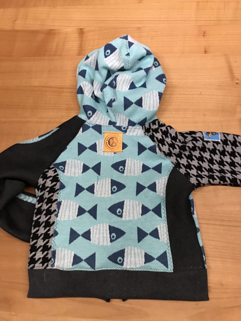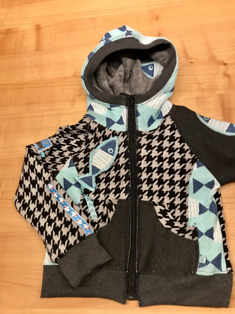 …und fertig ist die Jacke für einen jungen Mann, der hoffentlich bald mit dem Grosspapi zum Fischen fahren darf. Petri Heil!
