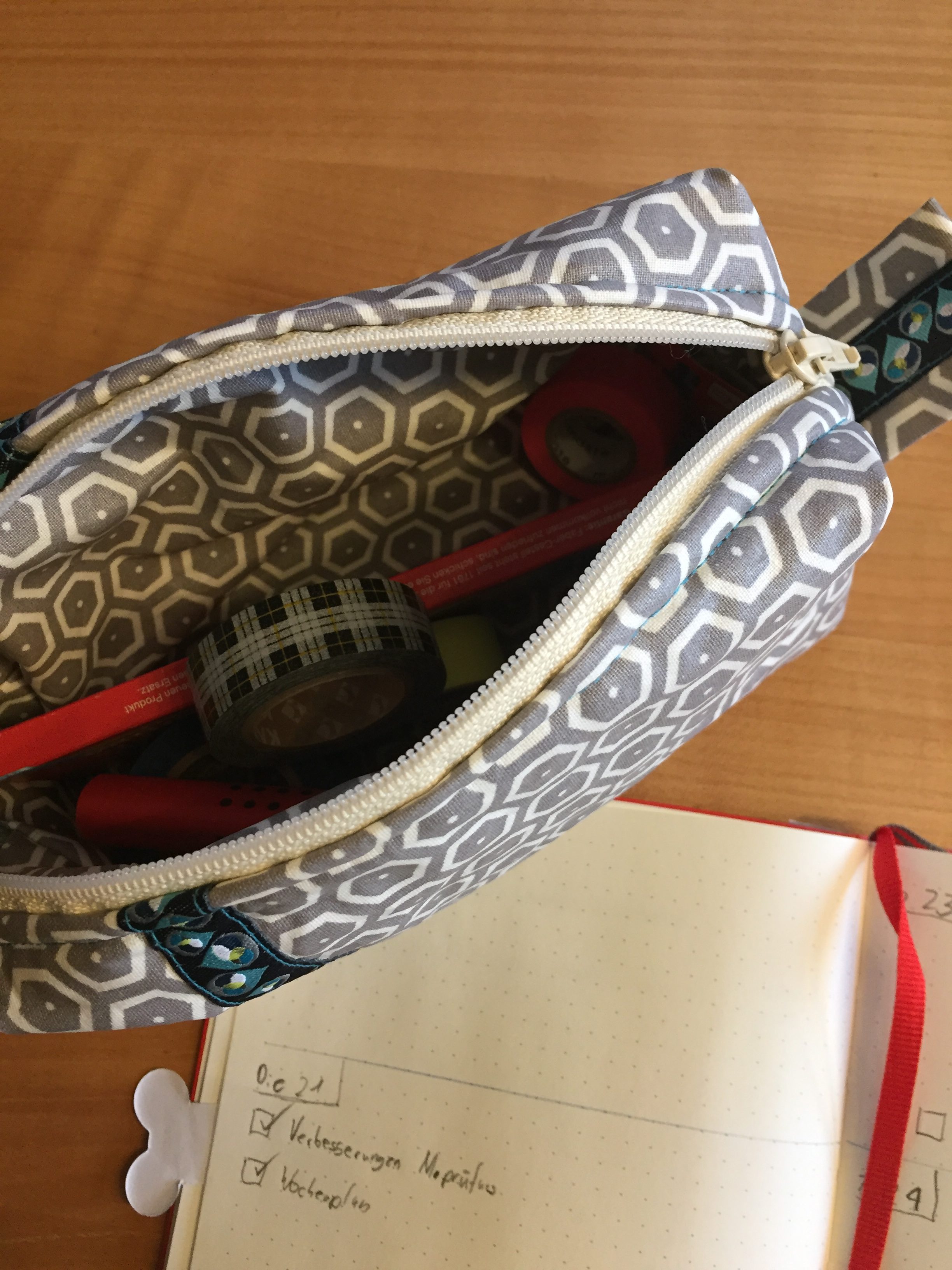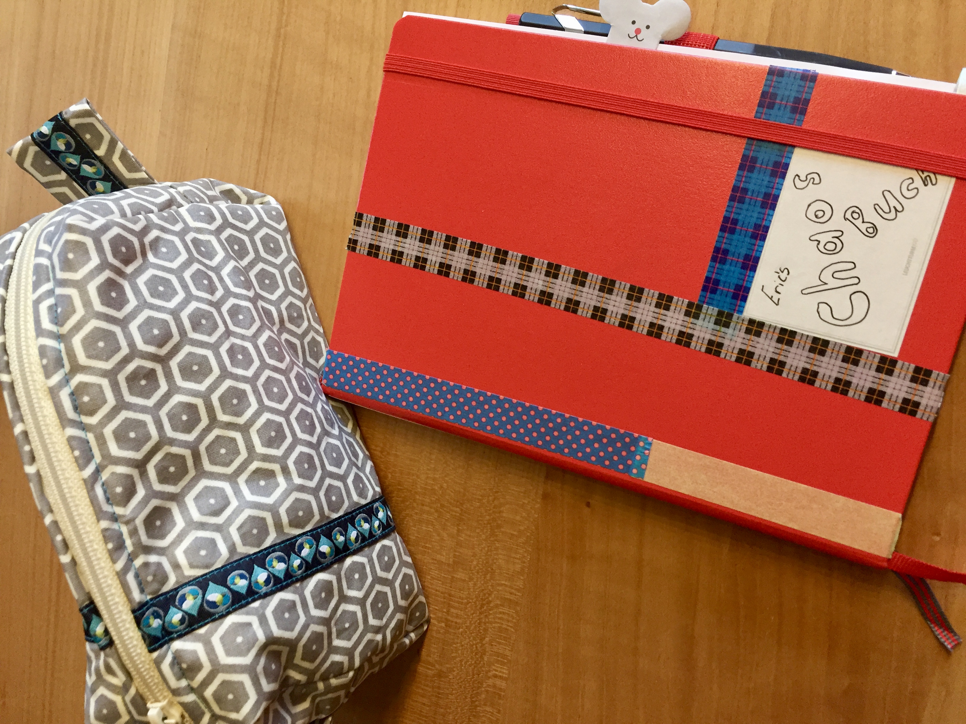Wir haben heute Erics Bullet-Journal eröffnet. Und weil dazu ein Etui mindestens mit Bleistift und Radiergummi, mit Farbstiften, verschiedenen Washi-Tapes, einem Spitzer und einem Tipp-Ex gehört, musste das auch noch her. Schnurpf ahoi!