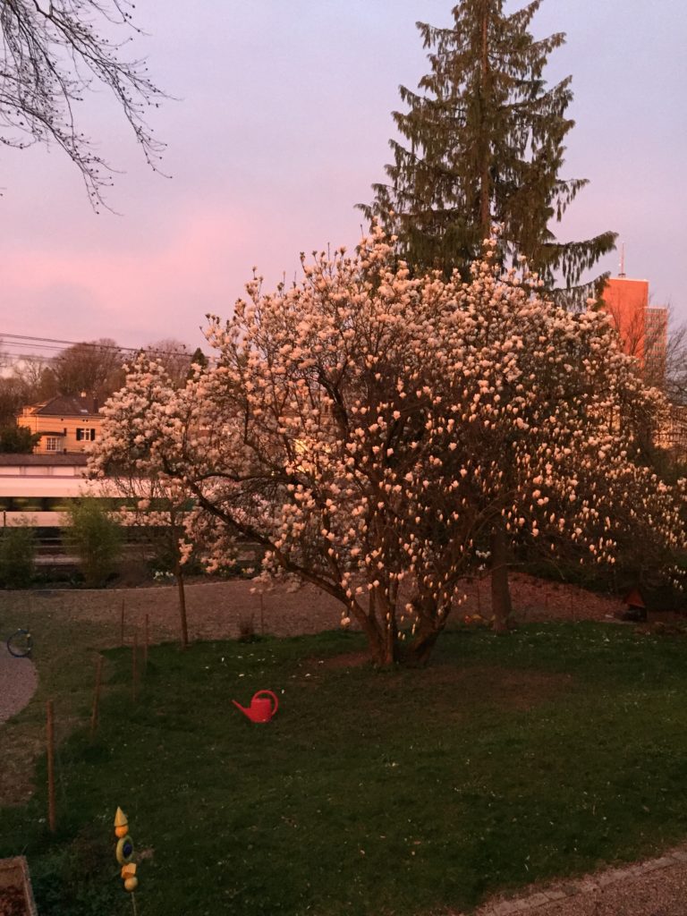 Ich meine äxgüsi, das entschädigt dann schon etwas. Oder hier, unser Magnolienstrauch in beinahe voller Blüte. Gut drei Wochen früher, als üblich.