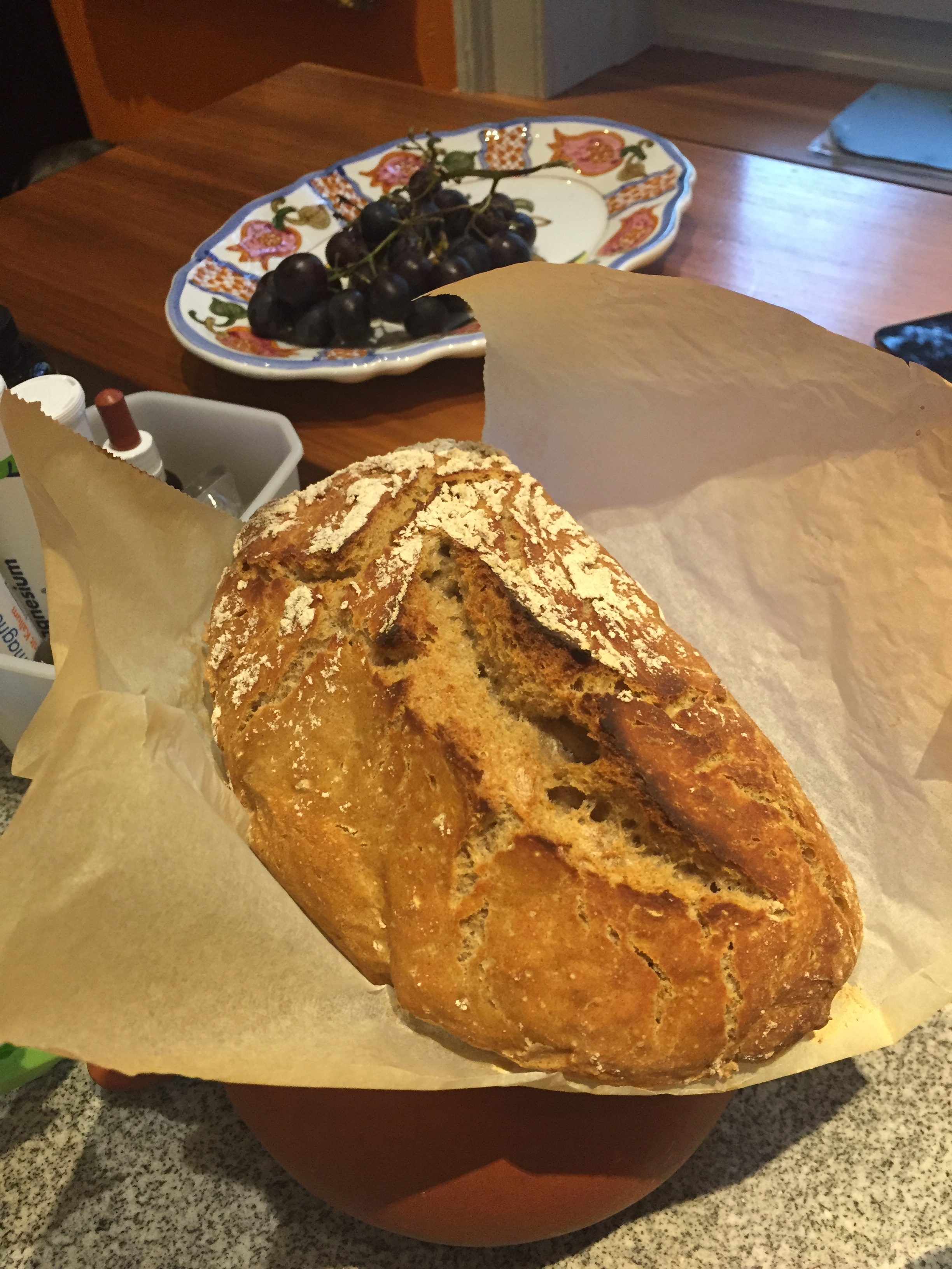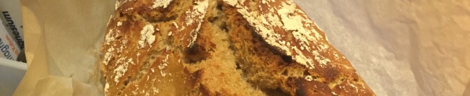 Noch etwas ausprobiert. Eine weitere Version meines „Brot für faule Leute“. Mehl, Flüssigkeit, Hefe, Salz zusammen leeren, dreimal rühren, WARTEN (gut und gerne 20h), einmal kneten, ab in den Backofen und mmmmmhhh!