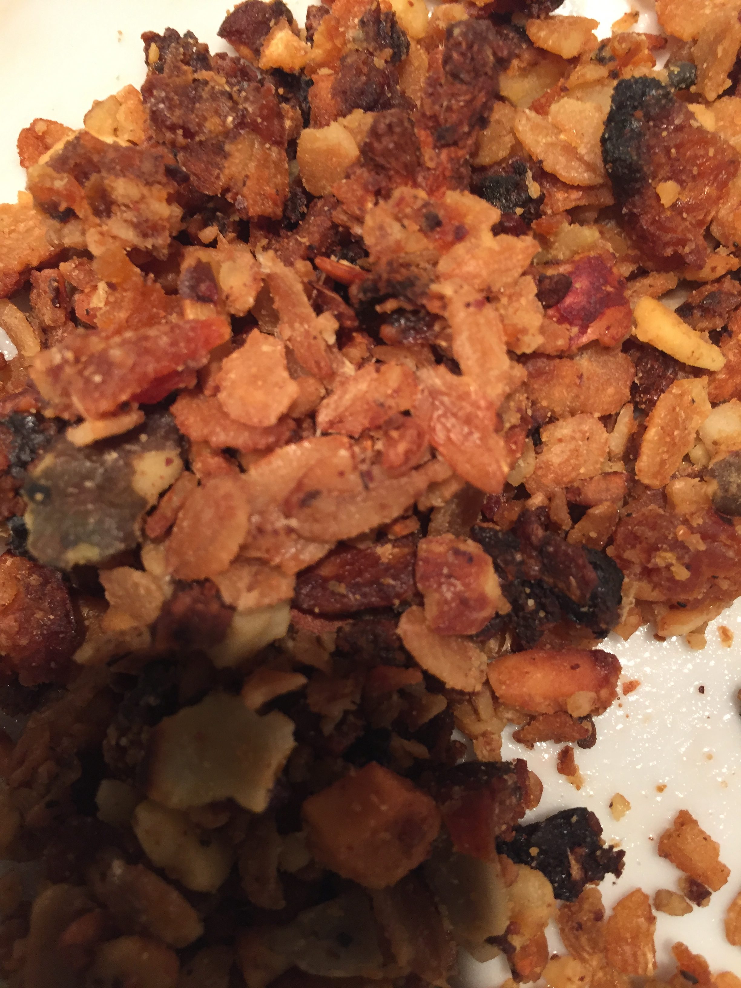 So habe ich mich wieder abgeregt und mich den leiblichen Genüssen hingegeben. Die neue „MIXX“ (jajaja, ich weiss, ich bin ein ewiger Thermomixprediger) hat viele neue Rezepte bereit. Ein überraschend gutes „Romanesco-Pürree mit Pesto) und ein infolge mangelnder Haftung als Granola umfunktioniertes Rezept für Knabberstengel haben wir ausgiebig getestet und degustiert. Also als Granola (einmal rühren auf Backblech und 15′ länger m Backofen inbegriffen) taugt der Kerne-Nuss-Früchtemix. Mmmhh!