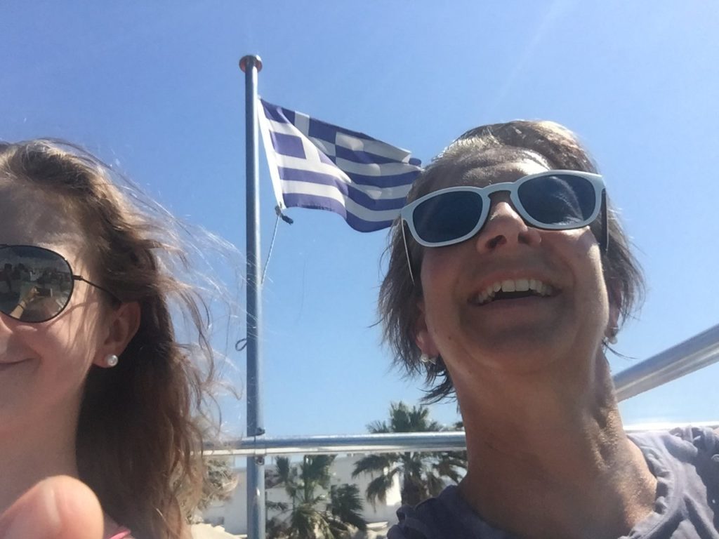 Im Land der Insel und Inselchen mussten wir natürlich eine Fähre benutzen und mit dem kleinen Schiff durch tosende Wellen (na ja) auf Antiparos fahren. Man beachte die griechische Flagge zwischen uns…