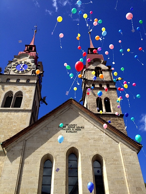 Nach einem so turbulenten Start in den Sonntag, konnten wir alle nicht „einfach so“ auseinander gehen und genossen den Apéro riche um die Kirche ausgiebig. Vielleicht wäre es besser gewesen, wir hätten den Kirchturm NACH dem Weisswein bestiegen…