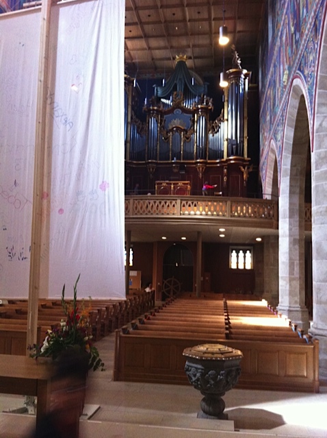 Wir haben gesungen (Text siehe unten), geschaut, die Kinder haben gebastelt und zum Schluss, war das Kirchenschiff zum Aufbruch bereit… Segel gesetzt, Ziel avisiert, Anker gelichtet und das Steuerrad war auch bereit…