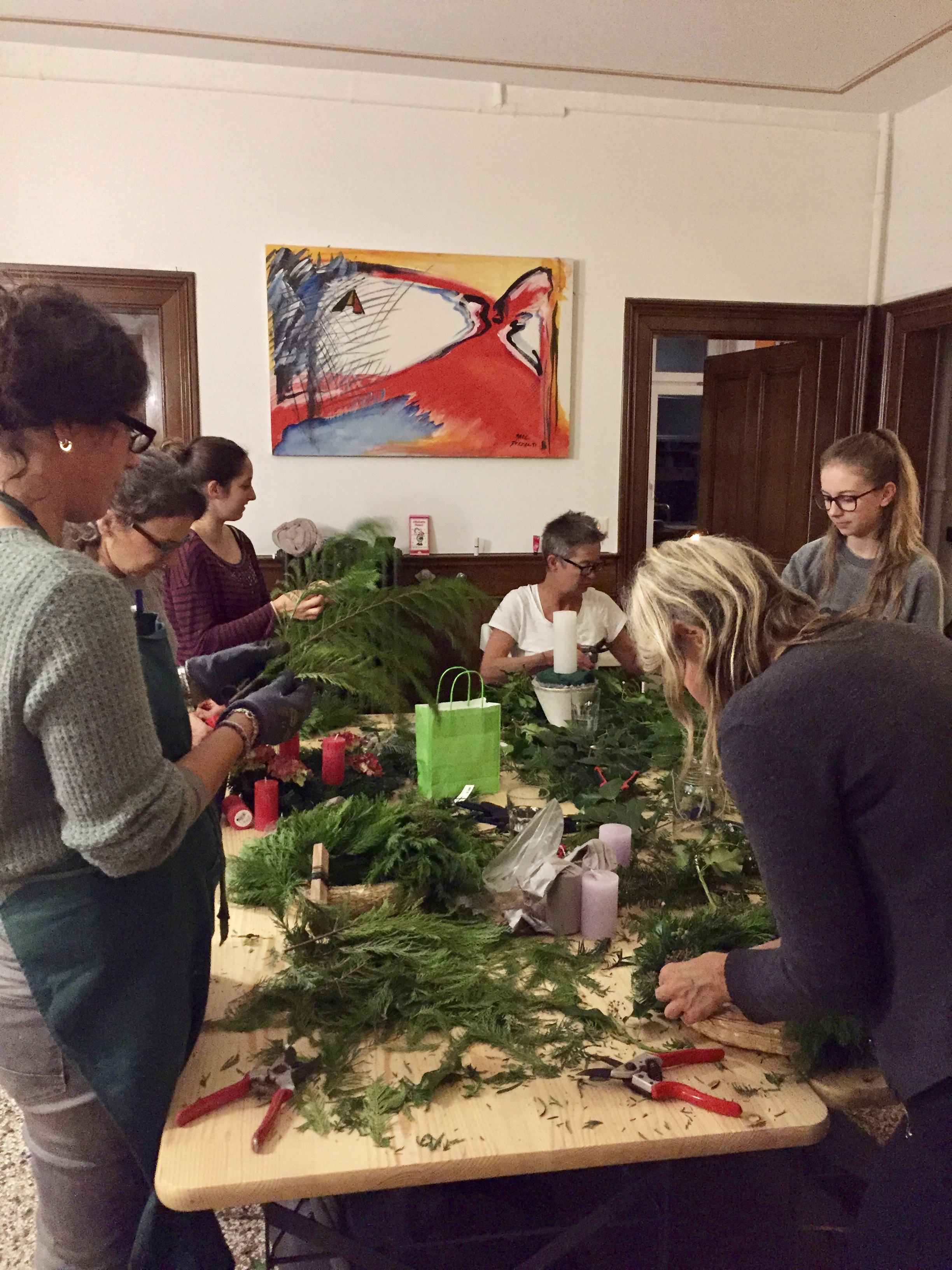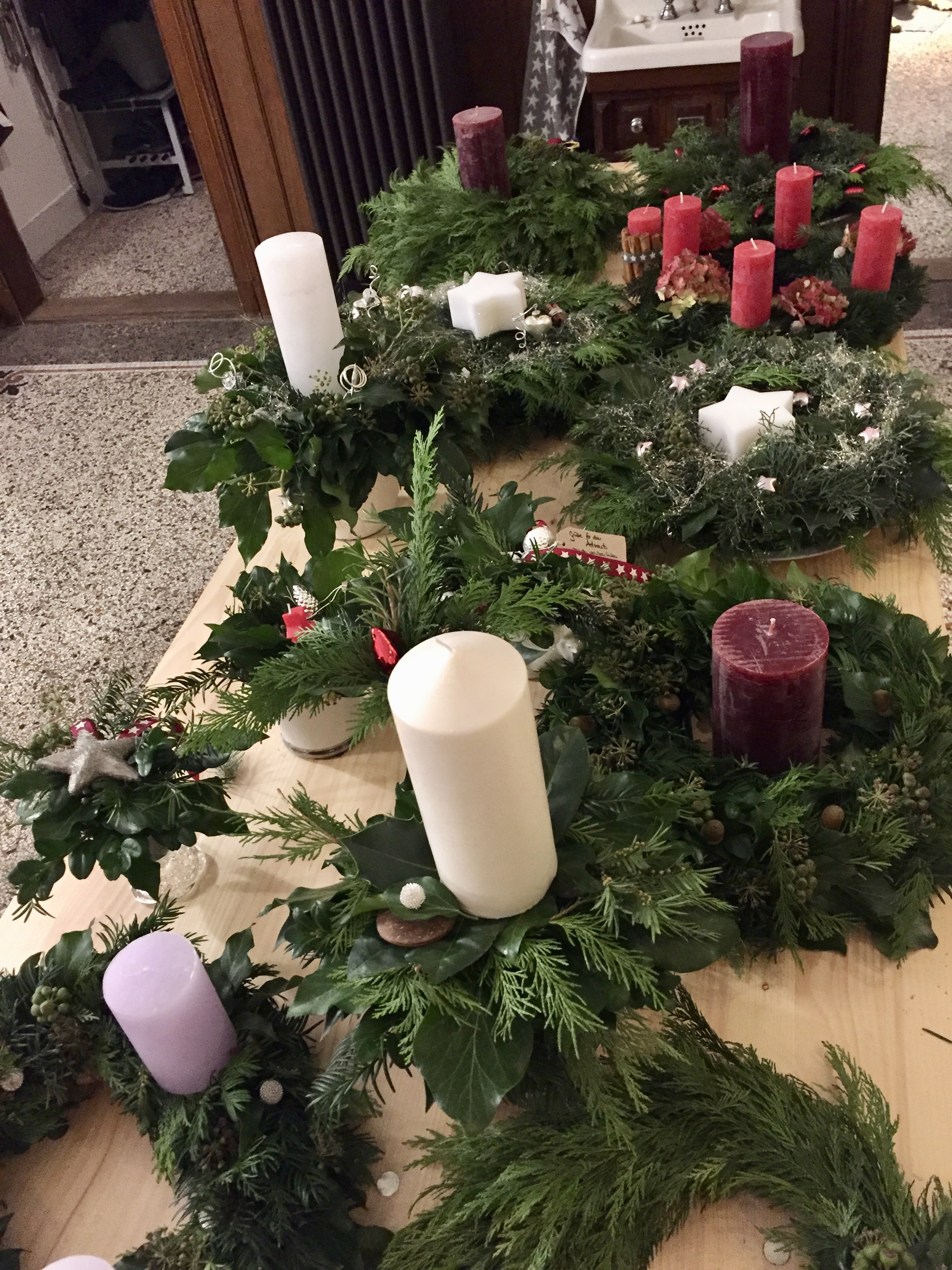 …und zu 11. Adventliches gebastelt. Wir haben Kränze gebunden und gesteckt, mit den Resten kleine Schnuckibutzidingerchen gesteckt, haben mit Sternen und Kerzen dekoriert und die Ausbeute?