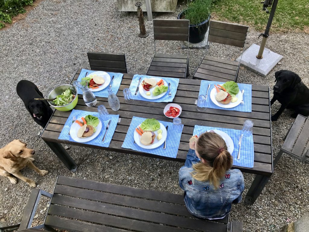 Montag ist Mittagstischtag. Will heissen, unser Esstisch -hier gerade die Freiluftvariante- ist gut bis sehr gut gefüllt, es plappert, plaudert, diskutiert und gestikuliert von 1155h bis 1245h mit Vehemenz und in aller Lautstärke – dann ist auf einen Schlag Ruhe und alle wieder auf dem Weg in die Schule.