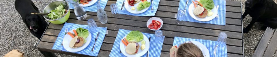 Montag ist Mittagstischtag. Will heissen, unser Esstisch -hier gerade die Freiluftvariante- ist gut bis sehr gut gefüllt, es plappert, plaudert, diskutiert und gestikuliert von 1155h bis 1245h mit Vehemenz und in aller Lautstärke – dann ist auf einen Schlag Ruhe und alle wieder auf dem Weg in die Schule.