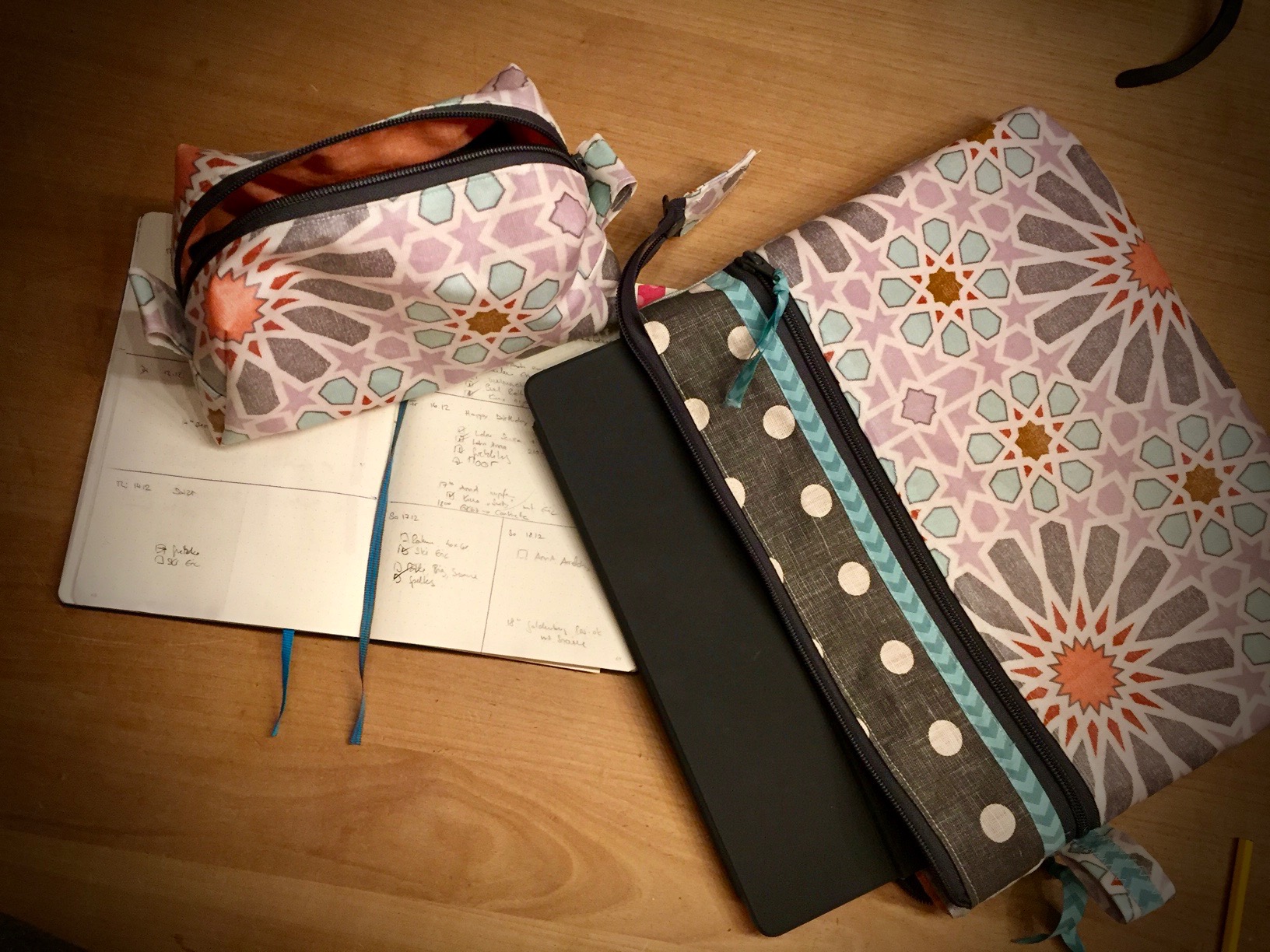 Beim zuschneiden dann die Erleuchtung… aus den Reste gibt es noch ein dazu passendes Etui. Und somit zeige ich Euch mein Trio. iPad-Behälter, Bullet-Journal (wer das nicht kennt… ein MUSS für kreative Chaoten, Details weiter unten) und die Kosmetiktasche Vicky von Pattydoo, die mich seit einiger Zeit begleitet (natürlich nur der Prototyp – nicht so schick assortiert), die Bildschirm-Brille, Stifte, Schlüssel, Notfall-Anti-Kopfweh etc. beinhaltet und wirklich in nullkomanix genäht ist.