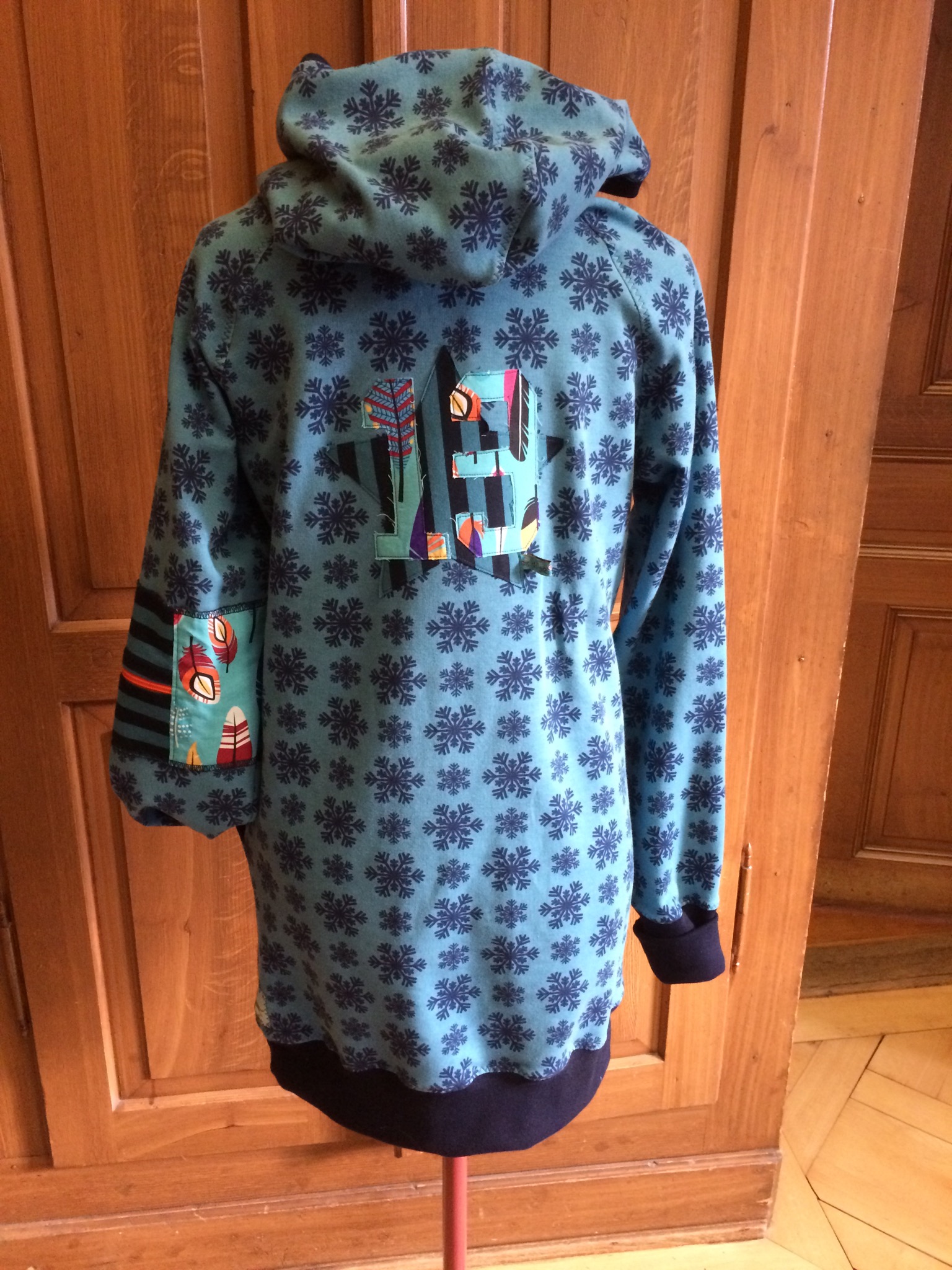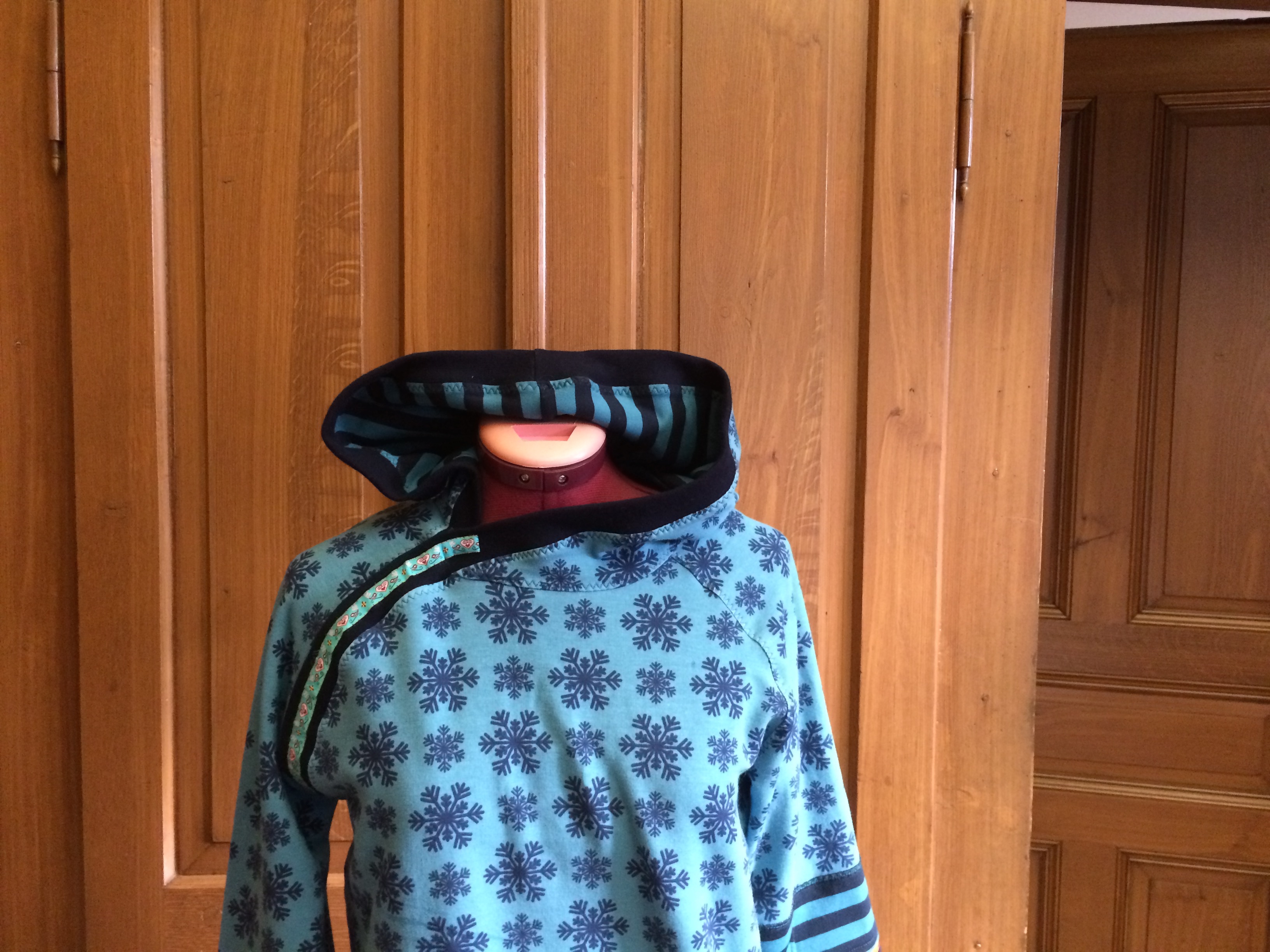 Ein neuer, spannender Schnitt mit asymmetrischem Verschluss (ach übrigens… das Futter der Kapuze ist dann andersrum asymmetrisch – hat mich eine schlaflose Nacht gekostet!) und Druckknopfband in der Raglannaht. Und ein wunderschöner Wintersweatshirtstoff mit Schneesternen. Gibt’s auch noch in anderen Farben. Kommt auch noch…