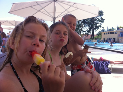 Und weil es doch jetzt auch endlich „richtig“ Sommer wurde, haben wir die Gunst des Nachmittags genutzt und sind ins Schwümbi gefahren. Ins allerschönste der Welt natürlich… Schön war es da. Leute, aber nicht zu viele, toll! und zwei Stunden habe ich das hier auch ausgehalten. Im Bild von links: Alison, AnnA, Eric mit Testosteronschub!