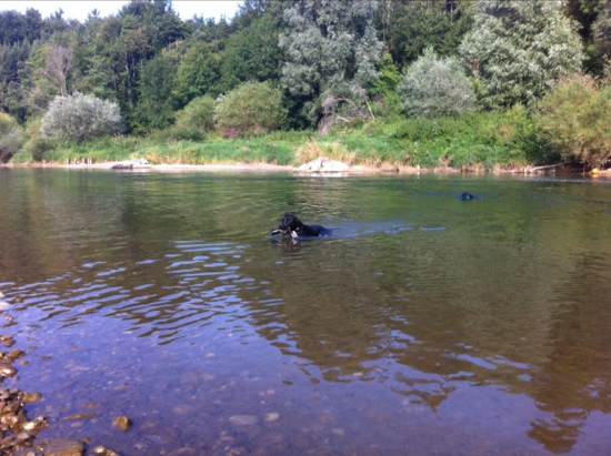 Es war offenbar genug warm und Bob ist das erst Mal in seinem Leben freiwillig hinter einem Dummy her GESCHWOMMEN! Jupijeeeh! das hat mich sehr gefreut. Er ist eben ein Langsamstarter, aber er startet.