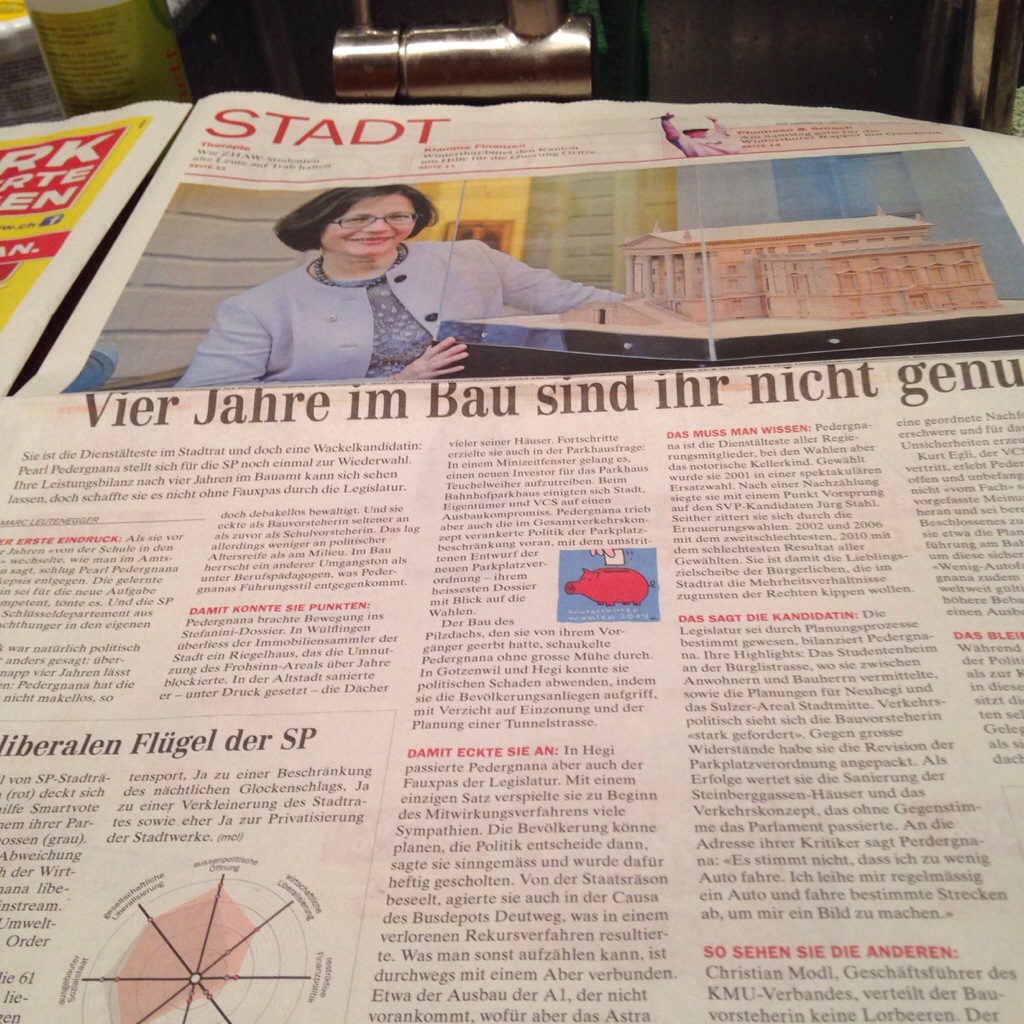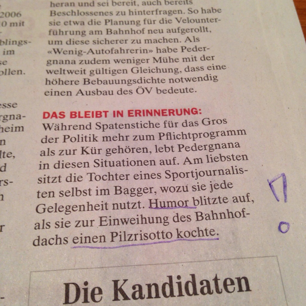Eine ganze Seite im hiesigen Lokalblatt über die dienstälteste (SP)-Stadträtin, die vor vier Jahren aus dem Schul- ins Baudepartement gewechselt hat. Unter der Rubrik „das bleibt“ dann die lapidare Vemerkung, dass unser Pearli Spatenstiche und Baggerfahrten liebt. Und beim Pilzrisotto kochen Humor aufblitzen lässt. Wahrlich ein grosser Leistungsnachweis…