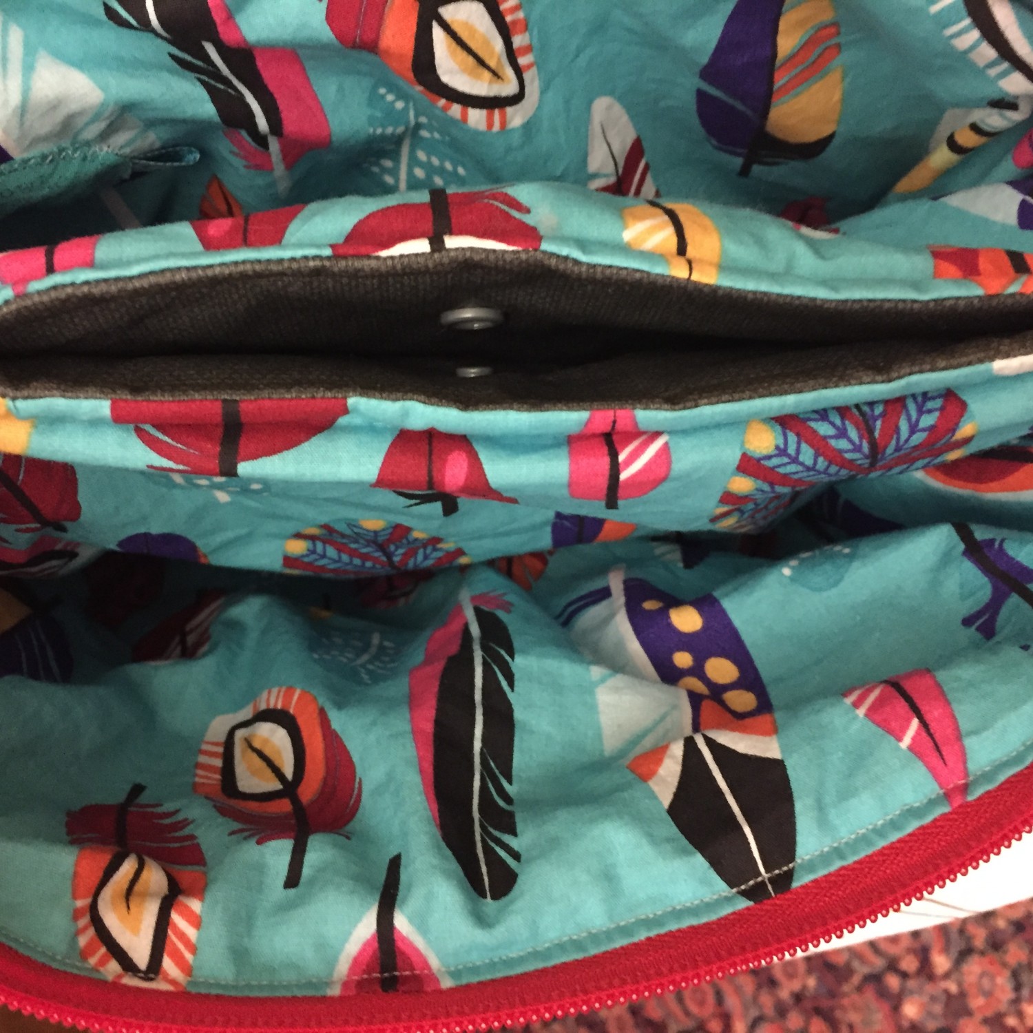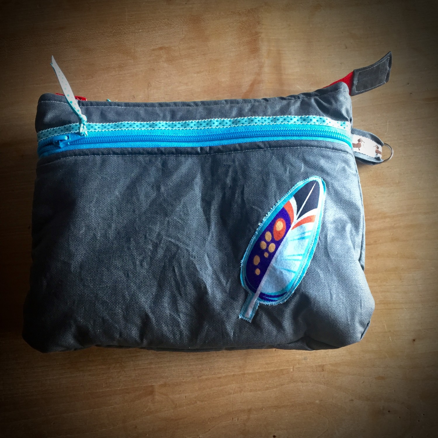 Und weil eine Tasche keine ist… musste ich noch was ausprobieren… ein dünner grauer Aussenstoff plastifiziert wurde mit Vlies „verdickt“. Nähtechnisch eine Herausforderung, Polsterung fürs Ipad hingegen perfetto und MEIN erklärter Lieblingsstoff mit den Federn ( Hamburger Liebe) endlich nur für mich vernäht.