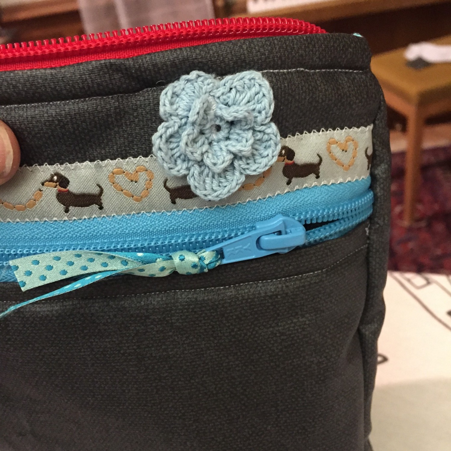 Stoff grau von Bolli Winterthur (aus der Restenkiste von mir), Federstoff dito, ebenso die Reissverschlüsse und die Dekobänder.