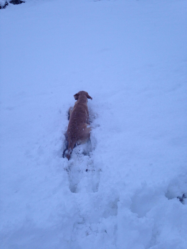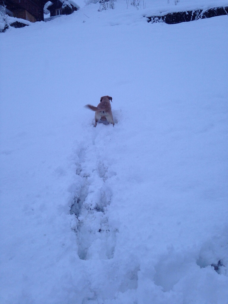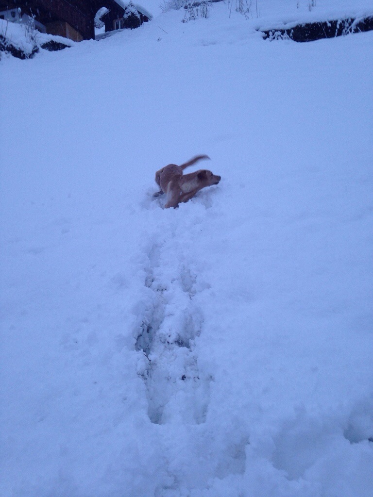 Unser Elio als Flachlandkind geboren, wird gerade tüchtig in die Bergwelt eingeführt. Schnee tauchen, Schnee fliegen, Flocken fangen, Flocken schlabbern und eben, Schnee schwimmen! Macht Spass. Und mindestens mittelfristig auch müde…