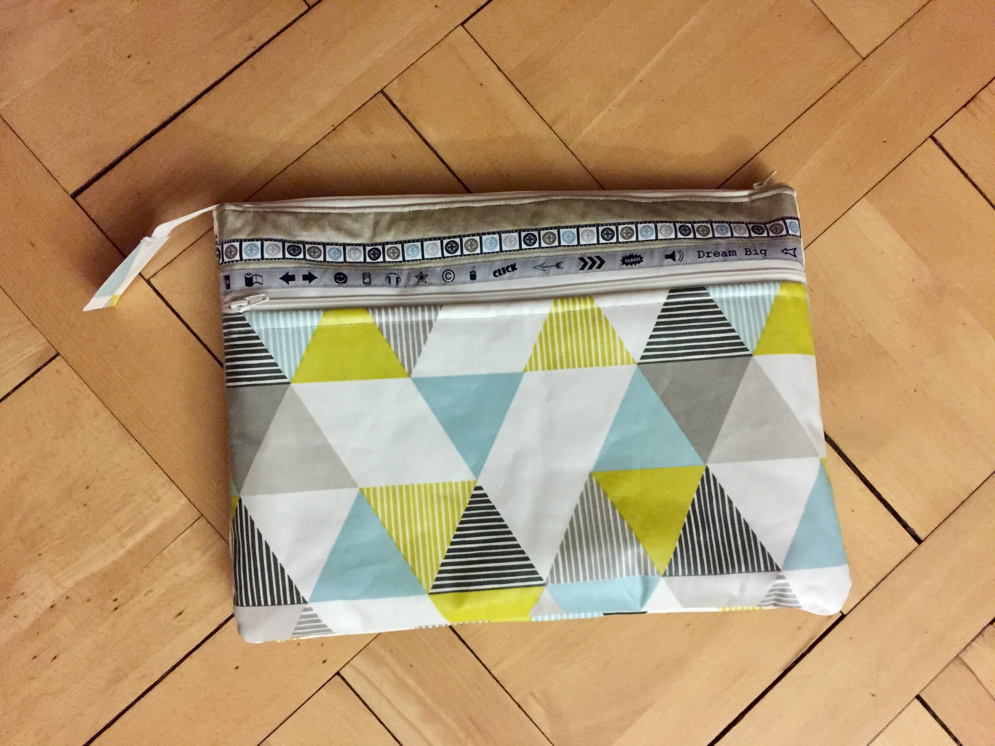 Eine Verpackung für einen RIESIGEN Laptop (der war so gewünscht – mir wäre das Teil ja echt zu unhandlich zum rumschleppen), gepolstert, mit Aussentaschen für Kabel, Maus, USB-Stick, für Chaotenbuch und andere unverzichtbare Dinge, wie etwa Plektren, Gitarrenersatzsaiten oder den Hausschlüssel.