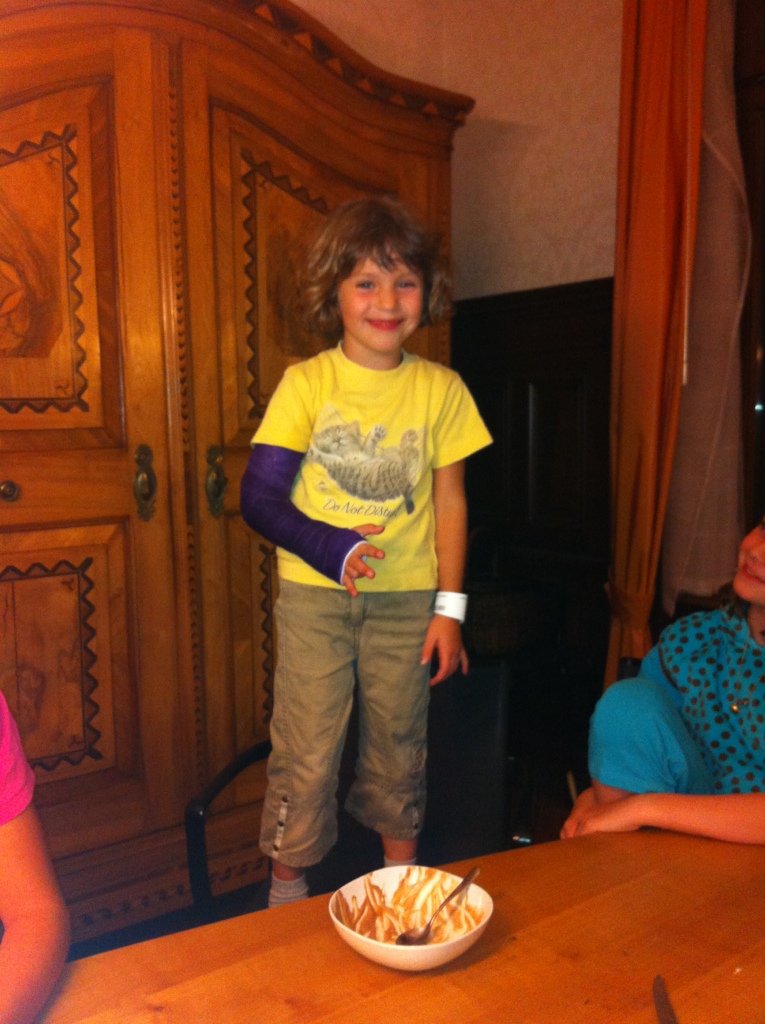 Heute dann hat es Fräulein S. Aus N. geschafft, sich den Oberarm anzuknacksen. So ein Pech aber auch! Glück im Unglück: die Nähe zum Spital ermöglichte die fliegende Verpflegung mit Kaffee fürs Mami und Rüeblikuchen für das Fräulein. Abend gerettet!
