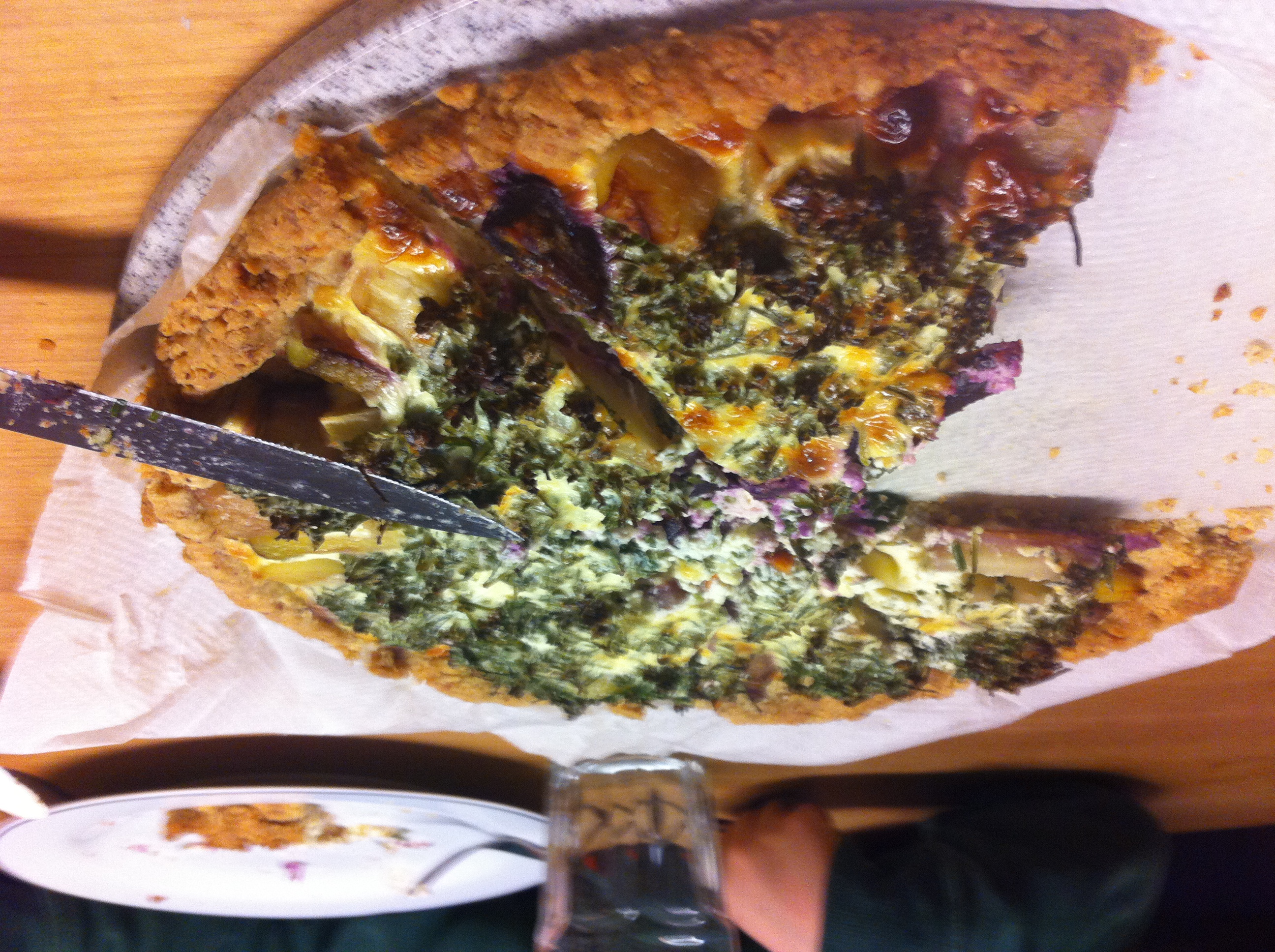 Butter in kleine Würfel schneiden und mit Mehl und Mandeln und Ei zu einem Teig verarbeiten. Teig in Backblech oder Quicheform auswallen (ok, auslegen ist auch gut) und kühl stellen.