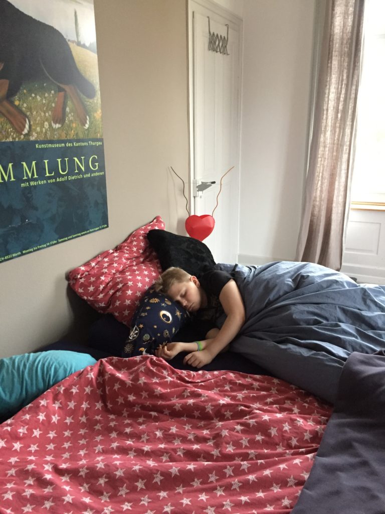 Eric schläft am morgen, am Mittag, am Nachmittag und am Abend schon wieder. Und dazwischen kommt er ganz weichgespült auf Stippvisite, kaut an einer Brotrinde und ist soooo müde, dass er umgehend zurück ins Bett klettert und weiterschläft. Auch an den unmöglichsten Orten…