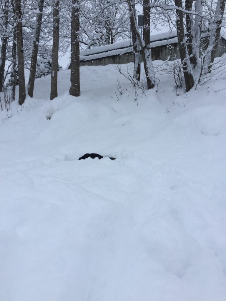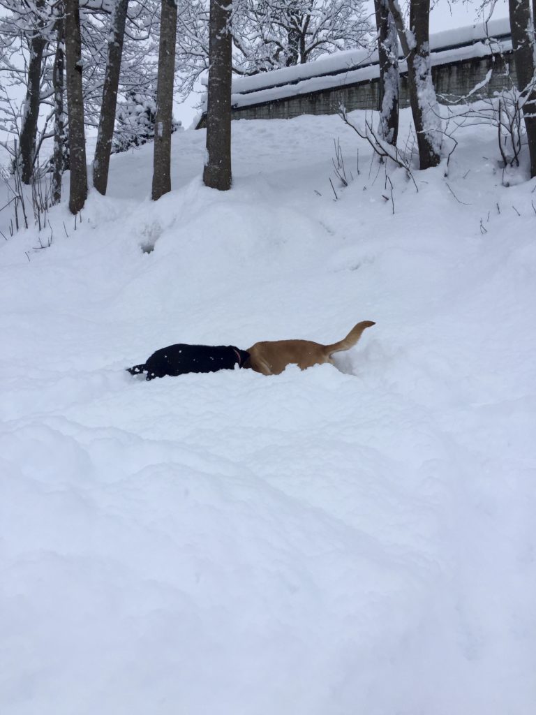 Es macht eindeutig mehr Spass, als grün-braune Pisten mit Schneeresten. Komplett von den Socken auch die Vierbeiner. Jodie raste übermütig die Strasse runter und sprang auf die vermeintliche Schneemauer…. ohalätz, weg war sie.