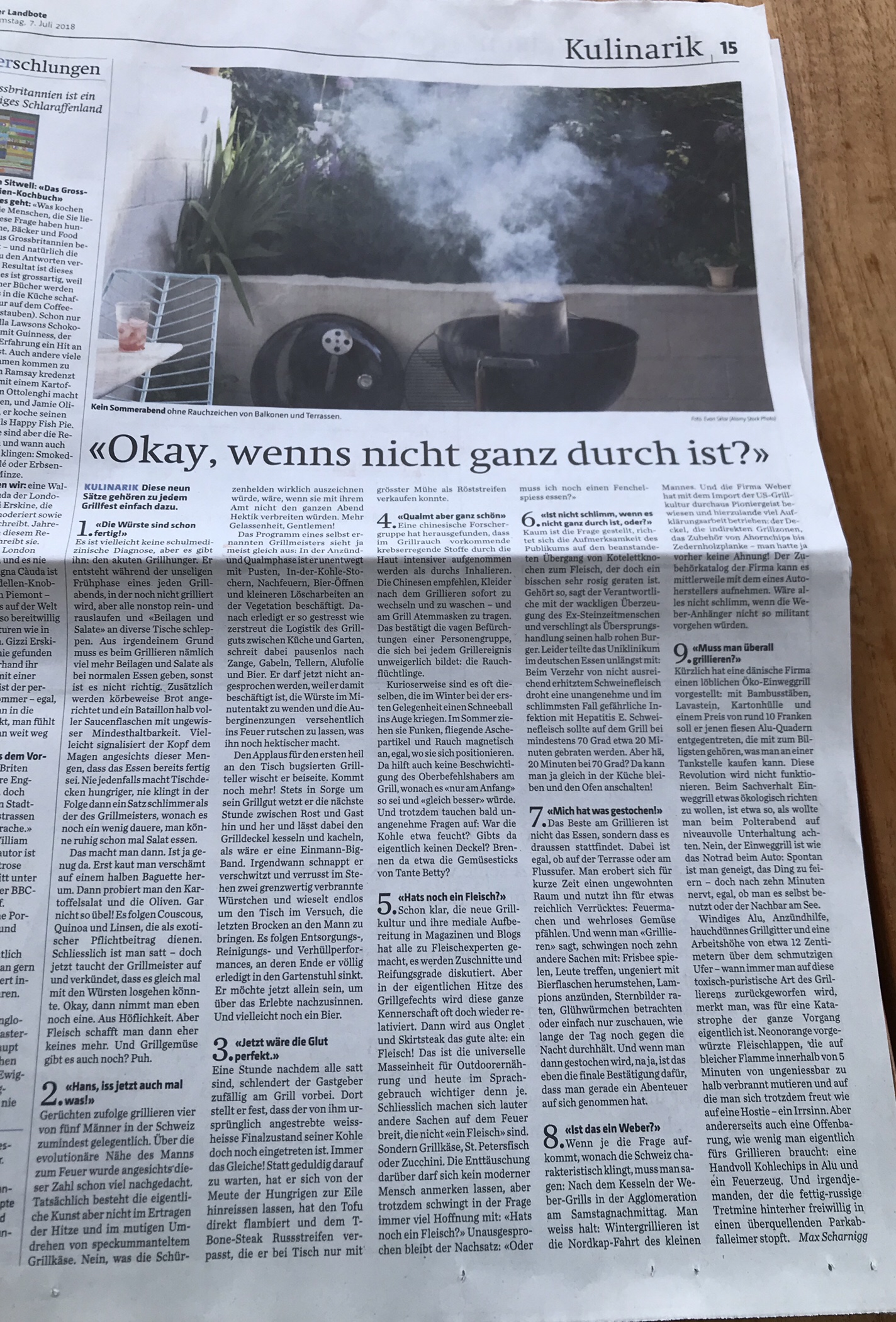 Bei der Lektüre der heutigen Ausgabe des Landboten (Sa 07.07.18 / Seite 15) habe ich mich köstlich amüsiert. Diesen Artikel möchte ich Euch nicht vorenthalten!«Okay, wenns nicht ganz durch ist?»KULINARIK Diese neun Sätze gehören zu jedem Grillfest einfach dazu.1.«Die Würste sind schon fertig!»Es ist vielleicht keine schulmedizinische Diagnose, aber es gibt ihn: den akuten Grillhunger. Er entsteht während der unseligen Frühphase eines jeden Grillabends, in der noch nicht grilliert wird, aber alle nonstop rein- und rauslaufen und «Beilagen und Salate» an diverse Tische schleppen. Aus irgendeinem Grund muss es beim Grillieren nämlich viel mehr Beilagen und Salate als bei normalen Essen geben, sonst ist es nicht richtig. Zusätzlich werden körbeweise Brot angerichtet und ein Bataillon halb voller Saucenflaschen mit ungewisser Mindesthaltbarkeit. Vielleicht signalisiert der Kopf dem Magen angesichts dieser Mengen, dass das Essen bereits fertig sei. Nie jedenfalls macht Tischdecken hungriger, nie klingt in der Folge dann ein Satz schlimmer als der des Grillmeisters, wonach es noch ein wenig dauere, man könne ruhig schon mal Salat essen.Das macht man dann. Ist ja genug da. Erst kaut man verschämt auf einem halben Baguette herum. Dann probiert man den Kartoffelsalat und die Oliven. Gar nicht so übel! Es folgen Couscous, Quinoa und Linsen, die als exotischer Pflichtbeitrag dienen. Schliesslich ist man satt – doch jetzt taucht der Grillmeister auf und verkündet, dass es gleich mal mit den Würsten losgehen könnte. Okay, dann nimmt man eben noch eine. Aus Höflichkeit. Aber Fleisch schafft man dann eher keines mehr. Und Grillgemüse gibt es auch noch? Puh.2.«Hans, iss jetzt auch mal was!»Gerüchten zufolge grillieren vier von fünf Männer in der Schweiz zumindest gelegentlich. Über die evolutionäre Nähe des Manns zum Feuer wurde angesichts dieser Zahl schon viel nachgedacht. Tatsächlich besteht die eigentliche Kunst aber nicht im Ertragen der Hitze und im mutigen Umdrehen von speckummanteltem Grillkäse. Nein, was die Schürzenhelden wirklich auszeichnen würde, wäre, wenn sie mit ihrem Amt nicht den ganzen Abend Hektik verbreiten würden. Mehr Gelassenheit, Gentlemen!Das Programm eines selbst ernannten Grillmeisters sieht ja meist gleich aus: In der Anzünd- und Qualmphase ist er unentwegt mit Pusten, In-der-Kohle-Stochern, Nachfeuern, Bier-Öffnen und kleineren Löscharbeiten an der Vegetation beschäftigt. Danach erledigt er so gestresst wie zerstreut die Logistik des Grillguts zwischen Küche und Garten, schreit dabei pausenlos nach Zange, Gabeln, Tellern, Alufolie und Bier. Er darf jetzt nicht angesprochen werden, weil er damit beschäftigt ist, die Würste im Minutentakt zu wenden und die Auberginenzungen versehentlich ins Feuer rutschen zu lassen, was ihn noch hektischer macht.Den Applaus für den ersten heil an den Tisch bugsierten Grillteller wischt er beiseite. Kommt noch mehr! Stets in Sorge um sein Grillgut wetzt er die nächste Stunde zwischen Rost und Gast hin und her und lässt dabei den Grilldeckel kesseln und kacheln, als wäre er eine Einmann-Big-Band. Irgendwann schnappt er verschwitzt und verrusst im Stehen zwei grenzwertig verbrannte Würstchen und wieselt endlos um den Tisch im Versuch, die letzten Brocken an den Mann zu bringen. Es folgen Entsorgungs-, Reinigungs- und Verhüllperformances, an deren Ende er völlig erledigt in den Gartenstuhl sinkt. Er möchte jetzt allein sein, um über das Erlebte nachzusinnen. Und vielleicht noch ein Bier.3.«Jetzt wäre die Glut perfekt.»Eine Stunde nachdem alle satt sind, schlendert der Gastgeber zufällig am Grill vorbei. Dort stellt er fest, dass der von ihm ursprünglich angestrebte weiss-heisse Finalzustand seiner Kohle doch noch eingetreten ist. Immer das Gleiche! Statt geduldig darauf zu warten, hat er sich von der Meute der Hungrigen zur Eile hinreissen lassen, hat den Tofu direkt flambiert und dem T-Bone-Steak Russstreifen verpasst, die er bei Tisch nur mit grösster Mühe als Röststreifen verkaufen konnte.4.«Qualmt aber ganz schön»Eine chinesische Forschergruppe hat herausgefunden, dass im Grillrauch vorkommende krebserregende Stoffe durch die Haut intensiver aufgenommen werden als durchs Inhalieren. Die Chinesen empfehlen, Kleider nach dem Grillieren sofort zu wechseln und zu waschen – und am Grill Atemmasken zu tragen. Das bestätigt die vagen Befürchtungen einer Personengruppe, die sich bei jedem Grillereignis unweigerlich bildet: die Rauchflüchtlinge.Kurioserweise sind es oft dieselben, die im Winter bei der ersten Gelegenheit einen Schneeball ins Auge kriegen. Im Sommer ziehen sie Funken, fliegende Aschepartikel und Rauch magnetisch an, egal, wo sie sich positionieren. Da hilft auch keine Beschwichtigung des Oberbefehlshabers am Grill, wonach es «nur am Anfang» so sei und «gleich besser» würde. Und trotzdem tauchen bald unangenehme Fragen auf: War die Kohle etwa feucht? Gibts da eigentlich keinen Deckel? Brennen da etwa die Gemüsesticks von Tante Betty?5.«Hats noch ein Fleisch?»Schon klar, die neue Grillkultur und ihre mediale Aufbereitung in Magazinen und Blogs hat alle zu Fleischexperten gemacht, es werden Zuschnitte und Reifungsgrade diskutiert. Aber in der eigentlichen Hitze des Grillgefechts wird diese ganze Kennerschaft oft doch wieder relativiert. Dann wird aus Onglet und Skirtsteak das gute alte: ein Fleisch! Das ist die universelle Masseinheit für Outdoorernährung und heute im Sprachgebrauch wichtiger denn je. Schliesslich machen sich lauter andere Sachen auf dem Feuer breit, die nicht «ein Fleisch» sind. Sondern Grillkäse, St. Petersfisch oder Zucchini. Die Enttäuschung darüber darf sich kein moderner Mensch anmerken lassen, aber trotzdem schwingt in der Frage immer viel Hoffnung mit: «Hats noch ein Fleisch?» Unausgesprochen bleibt der Nachsatz: «Oder muss ich noch einen Fenchelspiess essen?»6. «Ist nicht schlimm, wenn es nicht ganz durch ist, oder?»Kaum