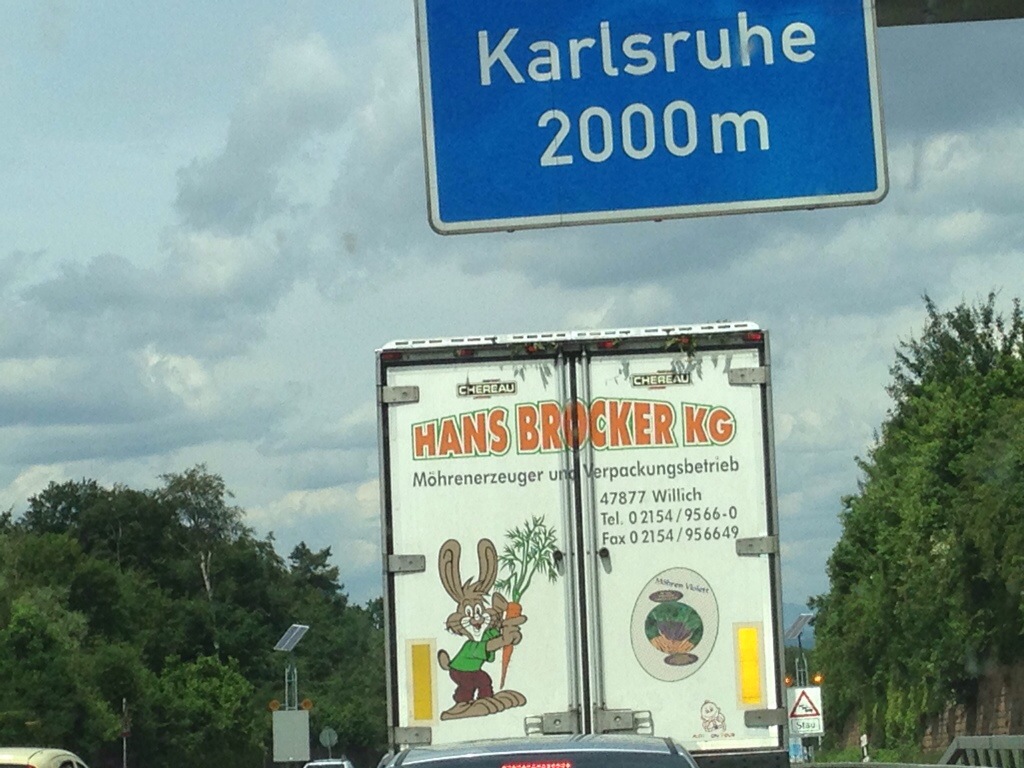 Wir hatten gut Zeit unterwegs, uns über eigenartige Dinge zu wundern… ich meine „Möhrenerzeuger“ tönt nicht wirklich, nach Landwirtschaft, Bio und knackigem Rüebli oder? Aber wir hatten wahrlich genügend Zeit, uns darüber zu wundern, standen wir doch vor/in/um Karlsruhe für eine gute Stunde mehr oder weniger am selben Ort.