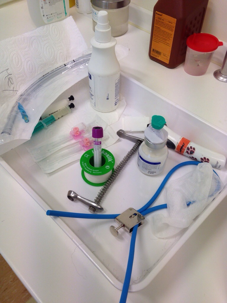 Ein Hundetier ums andere wurde mit Propofol (does it ring a bell? Michael Jackson?) in den Schlaf gespritzt, auf dem Chärreli ins Röntgen gefahren, dann kam das Tier wieder – selten so friedlich schlafend. Aber die Ruhe hielt nicht lange an und schon bald strampelte und quietschte Elio wieder durch die Gegend. Ebby-Eva, Elio, Enzo, Eddi und Elven – alle auf den ersten Blick mit einwandfreien Gelenken – das war eine Freude!