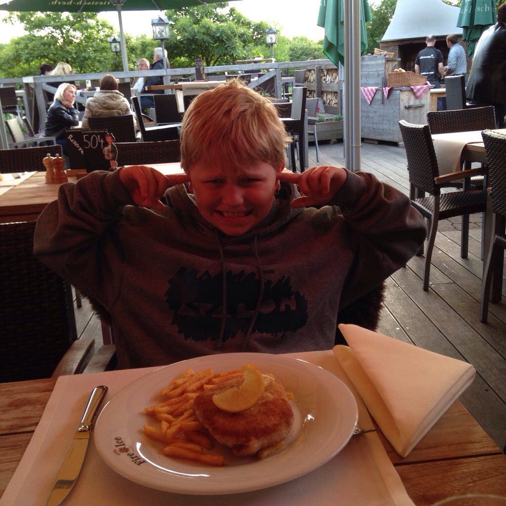 Aber wir waren ja im Biergarten. Mit Holztischen, Lammfellen, mit Resi auf der Alm, Dirndl und entsprechender Musik. Eric war begeistert…