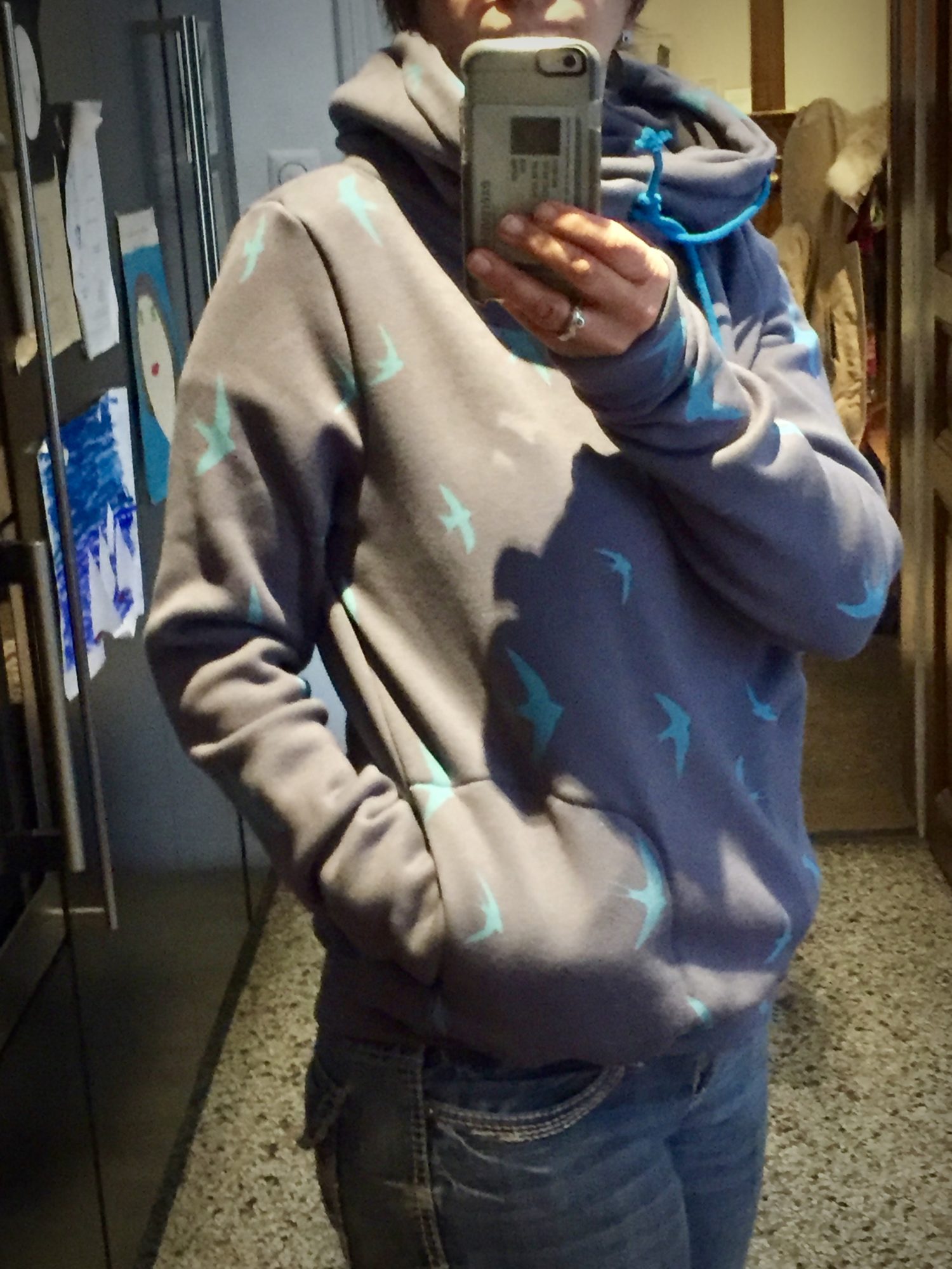 Ein toller Schnitt, beim nächsten Mal gerne 3cm länger für mich. Tolle Taschen, die man kaum sieht, Daumenlöcher beim Ärmelbündchen und gegen die zugige Bise eine tolle Kapuze oder ein toller Rollkragen. Genäht in gut 2h mit Videoanleitung wenn nötig – wirklich gut gezeigt! zugeschnitten auch ganz flott, wenn man dann genügend Stoff gekauft hätte…