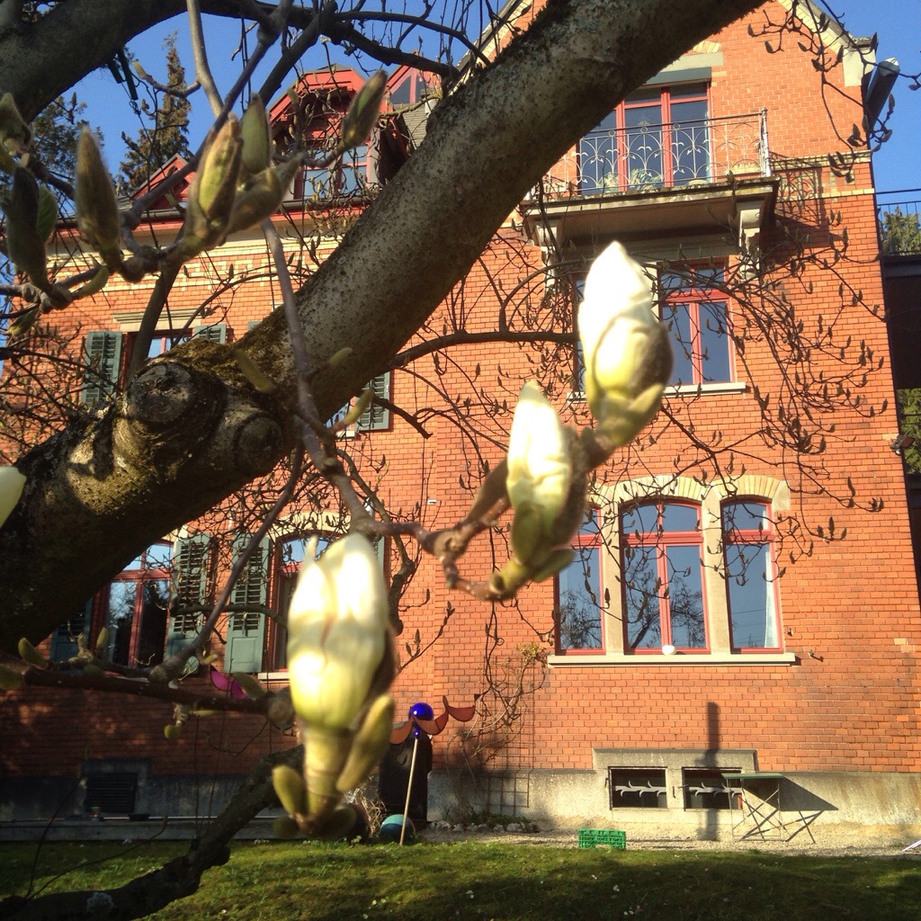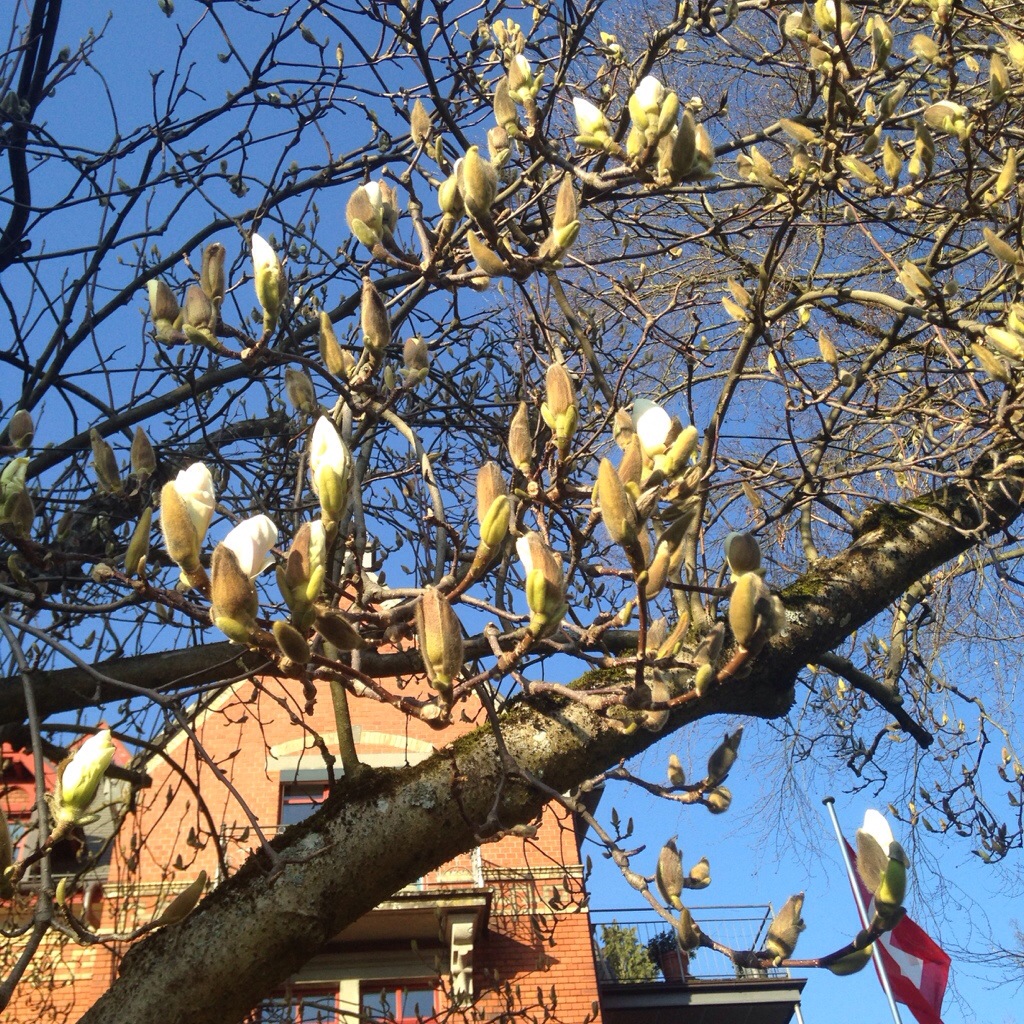 Die Magnolie macht sich auf zu blühen! Schon!!!! Schön! Wir nehmen’s!