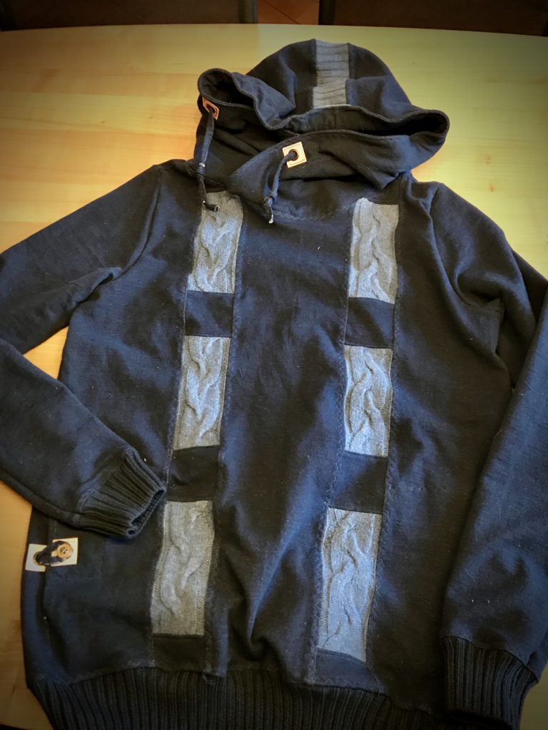Und damit auch das alte Bördli noch etwas Verwendung findet, hat die Kapuze einen Mittelstreifen bekommen. Alles übrigens ergänzt mit jeansblauem Sweatshirtstoff (und nicht so grau, wie auf diesem Bild). Noch fehlt die passende Kordel – mir schwebt was vor, aber da der künftige Besitzer dringend ein „Gute-Besserungs-Geschenk“ brauchte, habe ich aus Jeans-Sweat-Resten schwups selbst eine Kordel gebastelt… die wird noch ersetzt. Noch gibt es auch kein Tragbild des Besitzers – immerhin, ist mir zu Ohren gekommen, passe der Pulli perfetto. Recht so!
