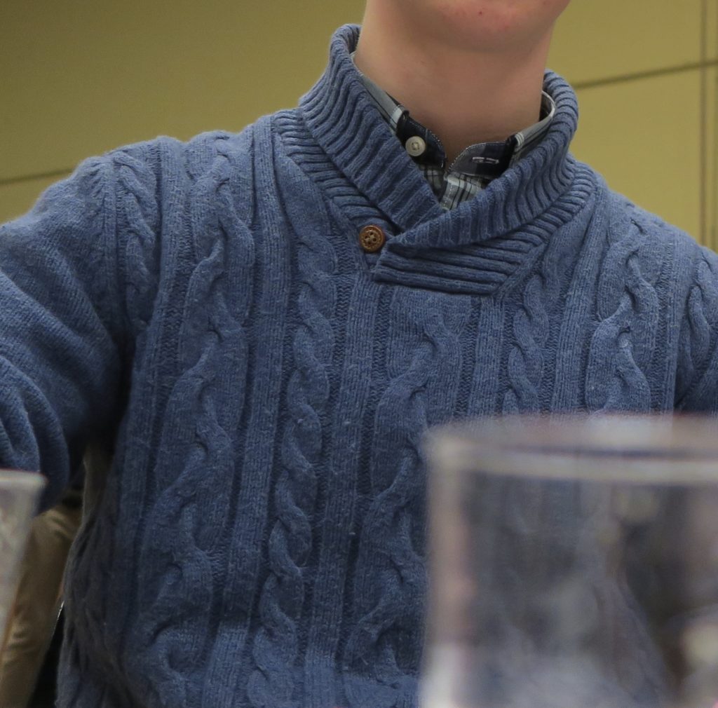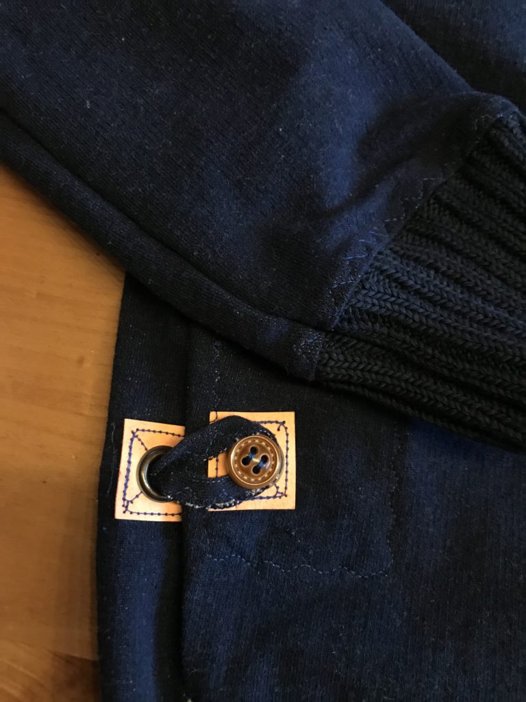 Der Kragenknopf musste einfach sein, aber da der Pullover neuerdings über eine Kapuze verfügt, musste ich den irgendwo anders unterbringen…