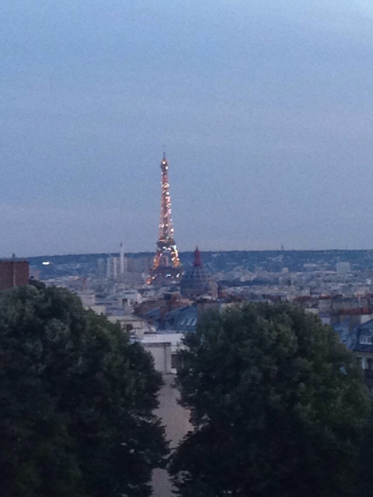 Nachtessen im Montmartrequartier, ein Schlummertrunkt auf der Terrasse im 7. Stock des Hotels und gerade zur Lightshow wieder im Zimmer mit Blick…