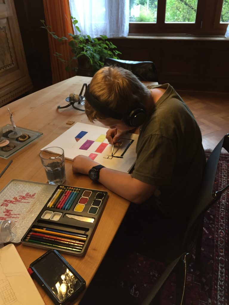Hat man daheim ein altes Haus, fasziniert einem das Moderne… und ohne viel Fachwissen, hat auch Eric erkannt, dass hier etwas qualitativ Hochwertiges steht. Die Verhältnisse von gross zu ganz, von gross zu klein, der Raster… haben umgehend ihren Niederschlag in Erics stiller Beschäftigung daheim gefunden.