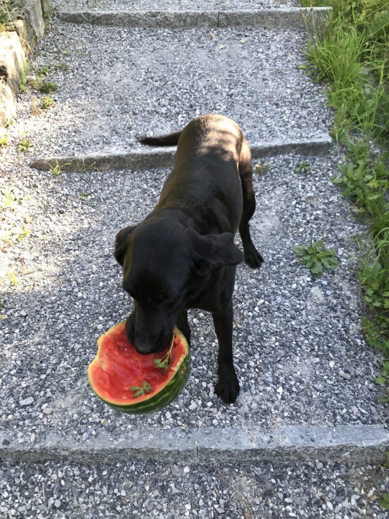 Wie passend doch, dass Jodie am frühen Freitagmorgen im Wald eine Melone gefunden hat! mit der Handhabung -das dumme Teil klappte ihr laufend über die Augen- hadert sie noch etwas, aber die Schale wurde nach Hause getragen und da bis auf den letzten Kern gefressen.