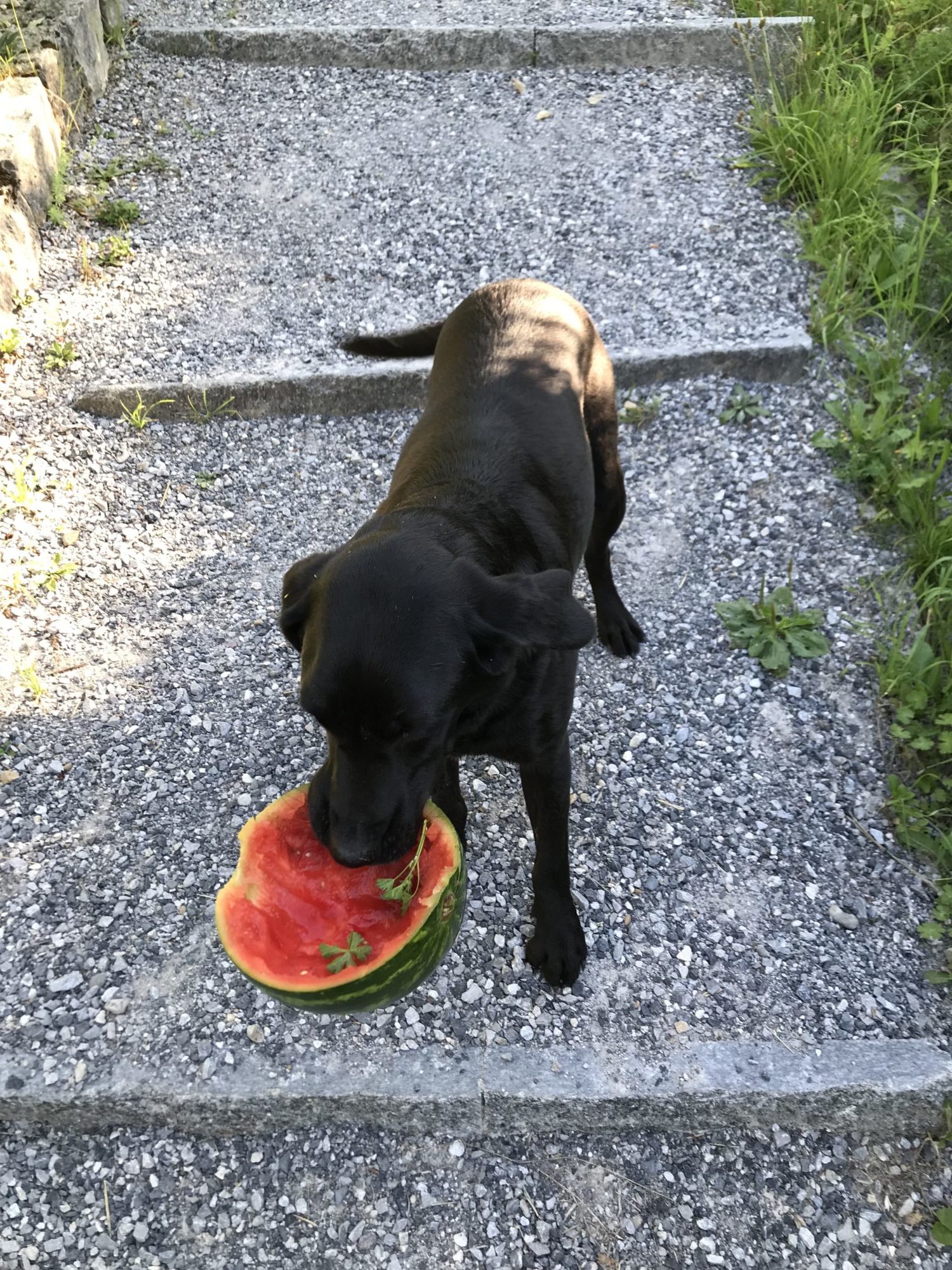 Wie passend doch, dass Jodie am frühen Freitagmorgen im Wald eine Melone gefunden hat! mit der Handhabung -das dumme Teil klappte ihr laufend über die Augen- hadert sie noch etwas, aber die Schale wurde nach Hause getragen und da bis auf den letzten Kern gefressen.