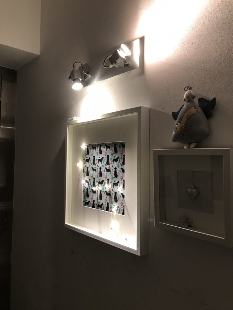 Im Eingang hängen zart beleuchtete Labrador-Retriever (ein Geschenkpapier übrigens) – illuminiert mit Samichlaus-Mützen aus dem One-Dollar-Shop. Im Hintergrund näht es fleissig weihnachtlich, zeigen kann ich das noch nicht. Leider. Und das Kitsch-Gen ausleben kann ich auch nicht. Es soll ja männlich-dezent sein. Öööööde ist das, sage ich Euch!