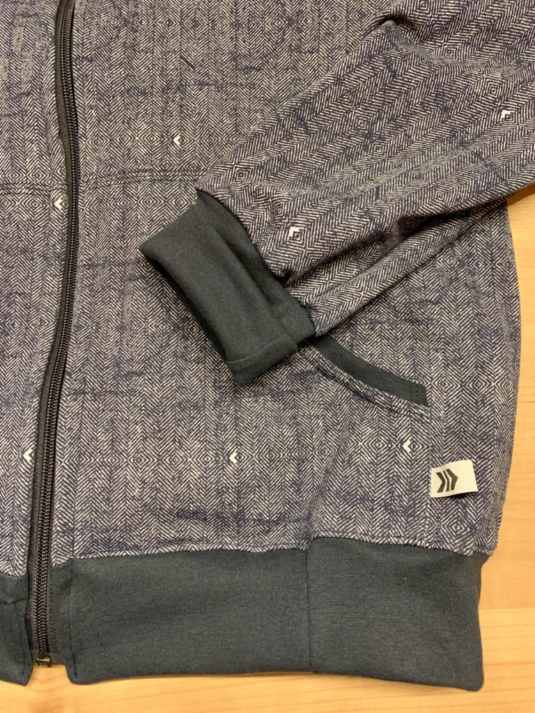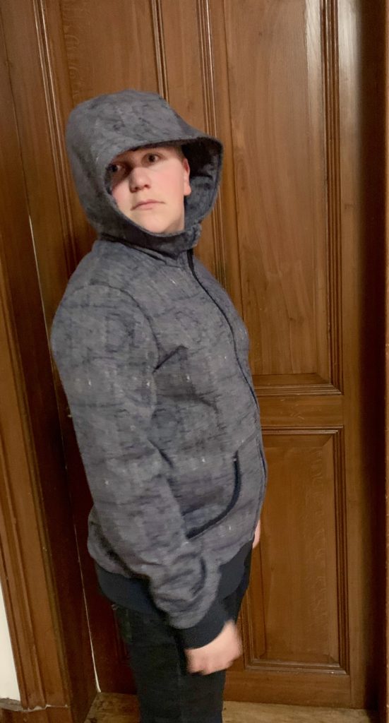 Eine Mr Sky von Mialuna – aus warmem Fleece. Gewünscht mit Kapuze und Eingriffstaschen und am liebsten hätte er sie grad ins Bett angezogen.
