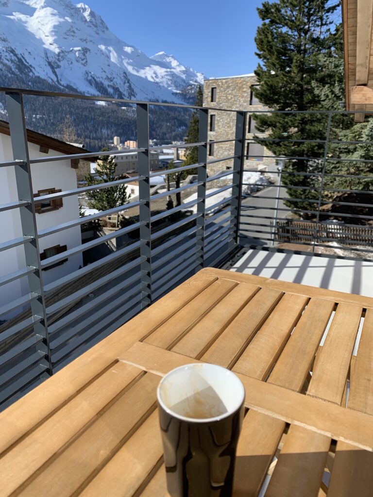 Die Hunde sind mit mir ins Engadin gefahren und geniessen da grad den ersten Kaffee an der Sonne. Also ich, die Hunde kauen an ihren harten Guetzlis rum.