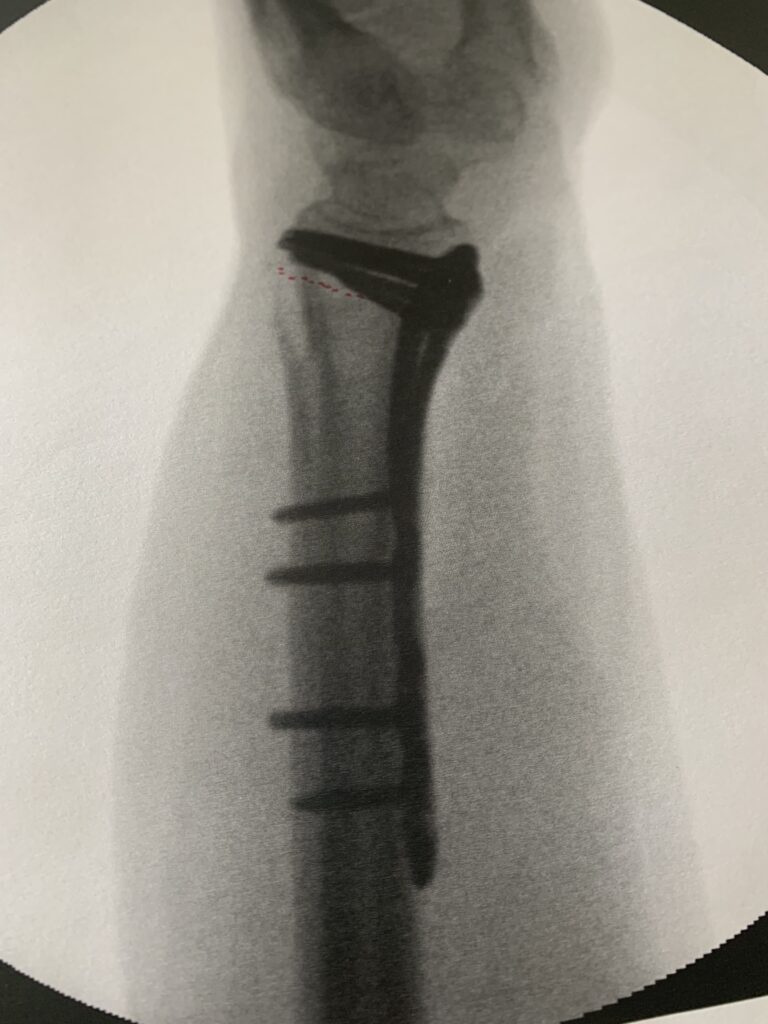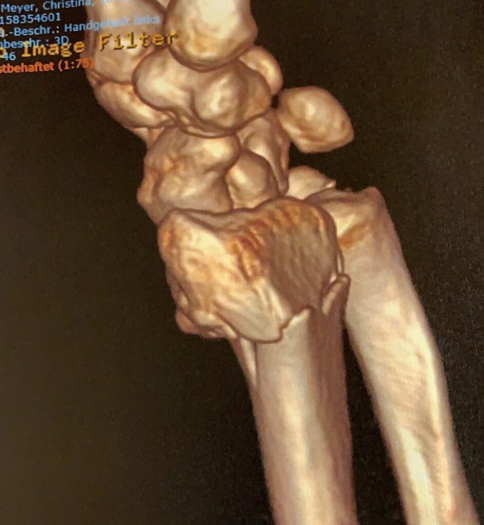 Die Folgen allerdings gravierend. Zwischenzeitlich bin ich stolzer (?) Besitzer eines Krokodils, welches die zerbröselten Knochenteile im Handgelenk mit einer grossen Portion Schrauben zusammen hält.