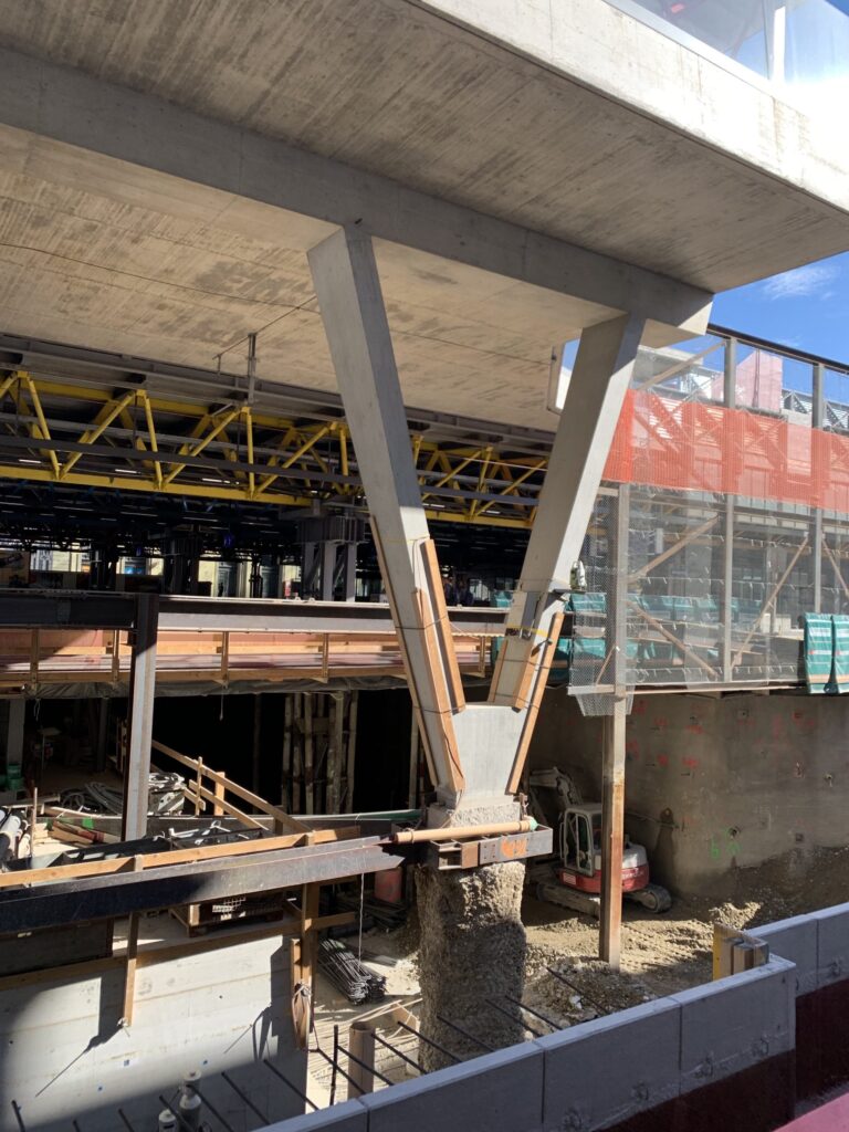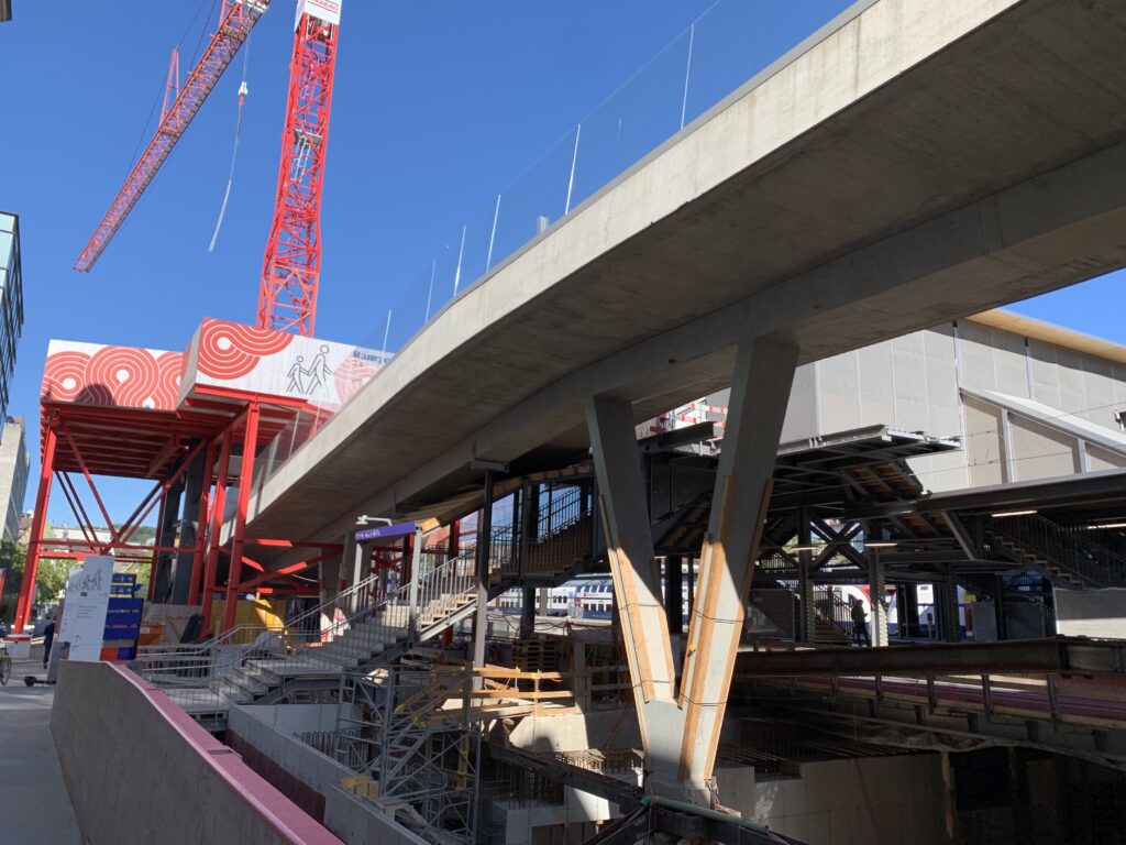 Eine Velounterführung. Konkret… unter einfahrenden Zügen (Bildmitte), dem zweistöckigen Parkhaus darüber, dem Perron und dem ganz normalen Fussgängerchaos wuseln hier emsig Spezialisten und betonieren und armieren und dichten mit furchtbar stinkiger Farbe etwas ab – den Gestank riecht man zum Glück nicht auf dem Bild 🙂