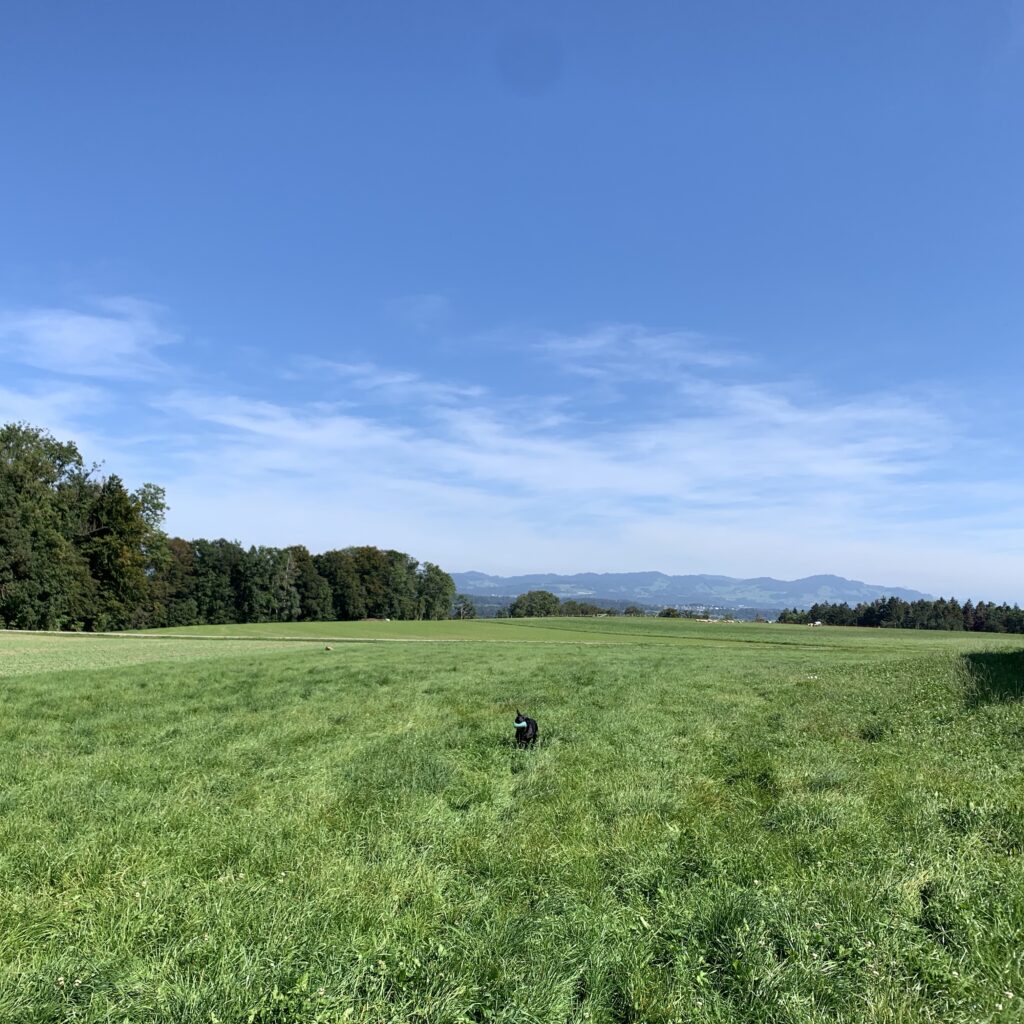 Das Altweibersommerwetter mit strammer Bise (lies: Kopfweh und brrrrr!) hielt Elio und mich allerdings nicht von der Masterclass ab. Im Hostig bei Lucrezia haben wir die Hunde ausgiebig müde gemacht. Eine ganz schwierige Wiese, mit hohem Gras, wechselnden Winderhältnissen und keinerlei Anhaltspunkte, um sich die Fallstelle zu merken. Für Hund. Und Meister… wir zwei waren nachhaltig geplättet danach.