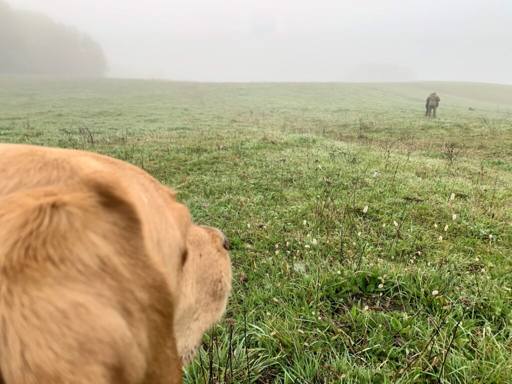 Auch Elio schaute voraus am Samstagmorgen im Hundetraining. Oder er versucht es wenigstens… eine extrem neblige Angelegenheit – klar im Vorteil, wer einen hellen Hund besitzt. Trotzdem… viel gesehen haben wir nicht. Die Flugzeuge flogen häufig an – auch die haben wir nicht gesehen im Anflug auf die Piste 34 am Flughafen Kloten.