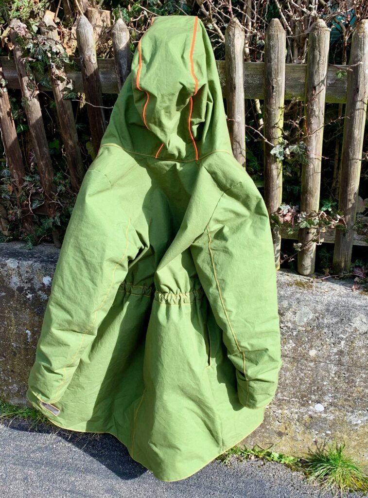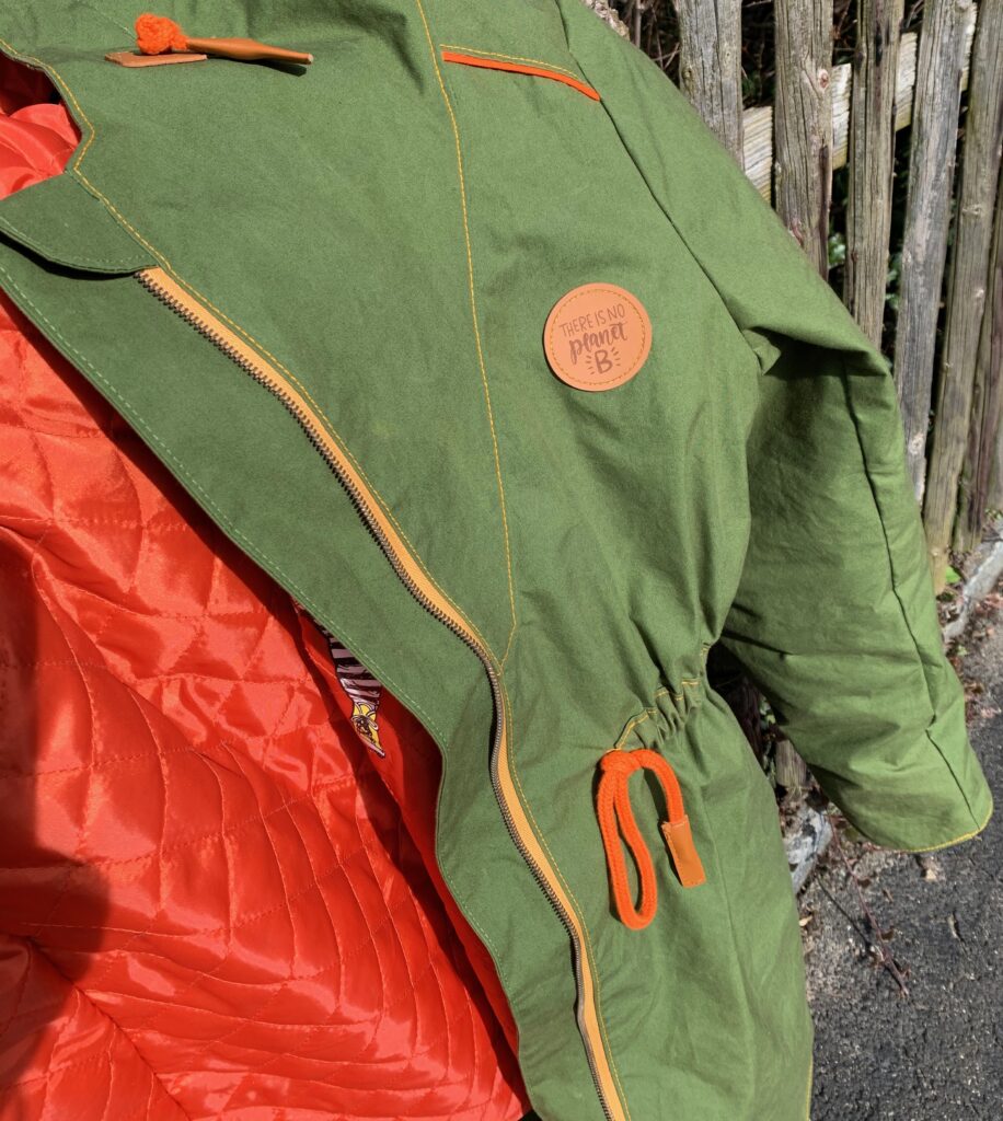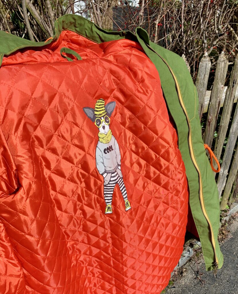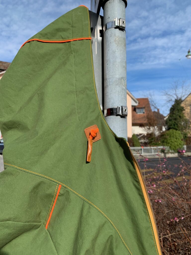 Nein, Tragefotos gibt es noch nicht, weil heute zwar das Wetter herrlich, aber kein Fotograf vorhanden. So gibt es einen Querschnitt «vom Gartenhag». Rückansicht, Vorderansicht mit tief eingesetzter Kapuze (das einzige wirklich Challenging-Teil am ganzen Nähstück), mein Daddy-Cool-Futter, noch eine Vorderansicht mit Taillenraffung, ein Aufnäher, der grad noch rechtzeitig hier eintrudelte, Kapuzendetail und ja natürlich, ich habe neue TiKoWis-Label in silber (und man sieht, dass ich die Seitennaht dahinter einmal auftrennen musste… tja, Startfehler – es ist aber der einzige geblieben!)