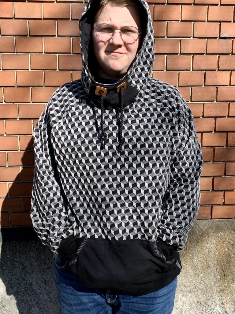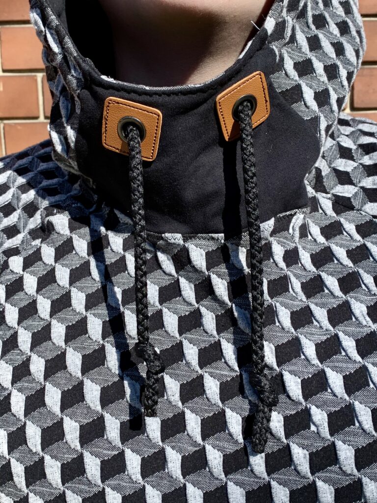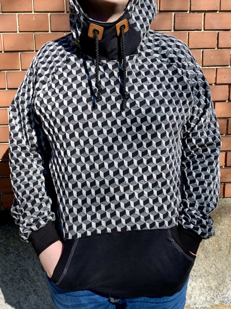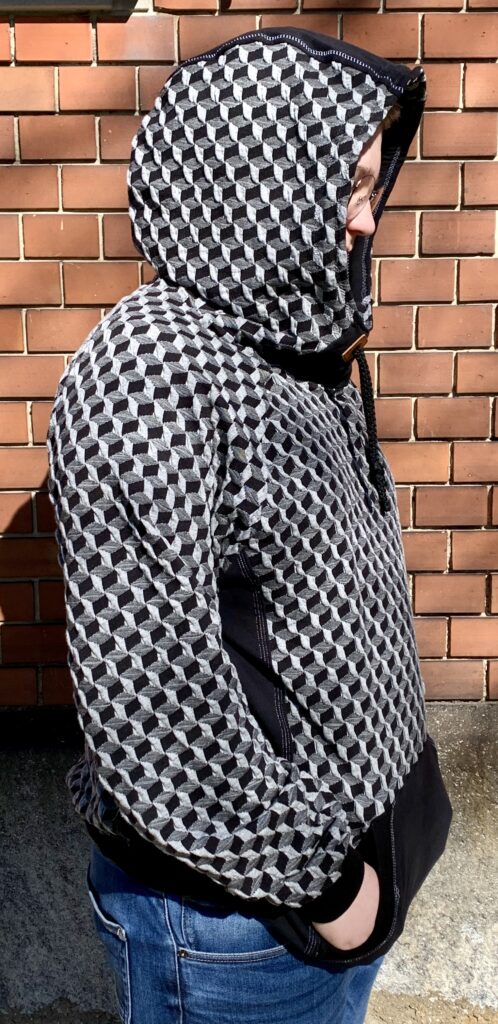 Schnitt: Mr. Comet von Mialuna, Stoff: «Diced Knit» aus der Serie «Plain Stitches» von Hamburger Liebe bestellt bei «Alles für Selbermacher» inklusive dem unifarbenen Jersey. Ösen und Kordel von www.kuntundbunt.ch