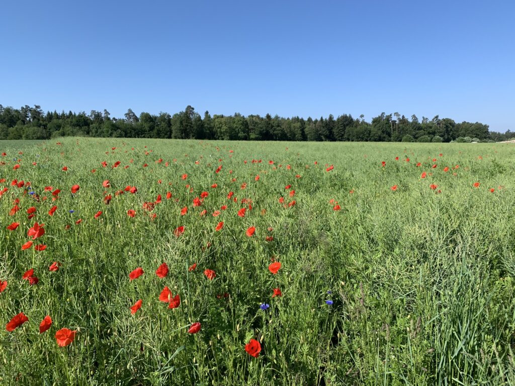 Das Wetter war für einmal grandios, warm, schön und ein Rapsfeld mit Mohnblumen drin, ist einfach immer ein Foto wert. Es ist übrigens eine Freude mit Jodie zu arbeiten… seitdem sie täglich ihre Ration Schilddrüsenhormon bekommt funktioniert die Konzentration, die Nase und sie hat Schwung ohne Ende. Und Hunger auch…