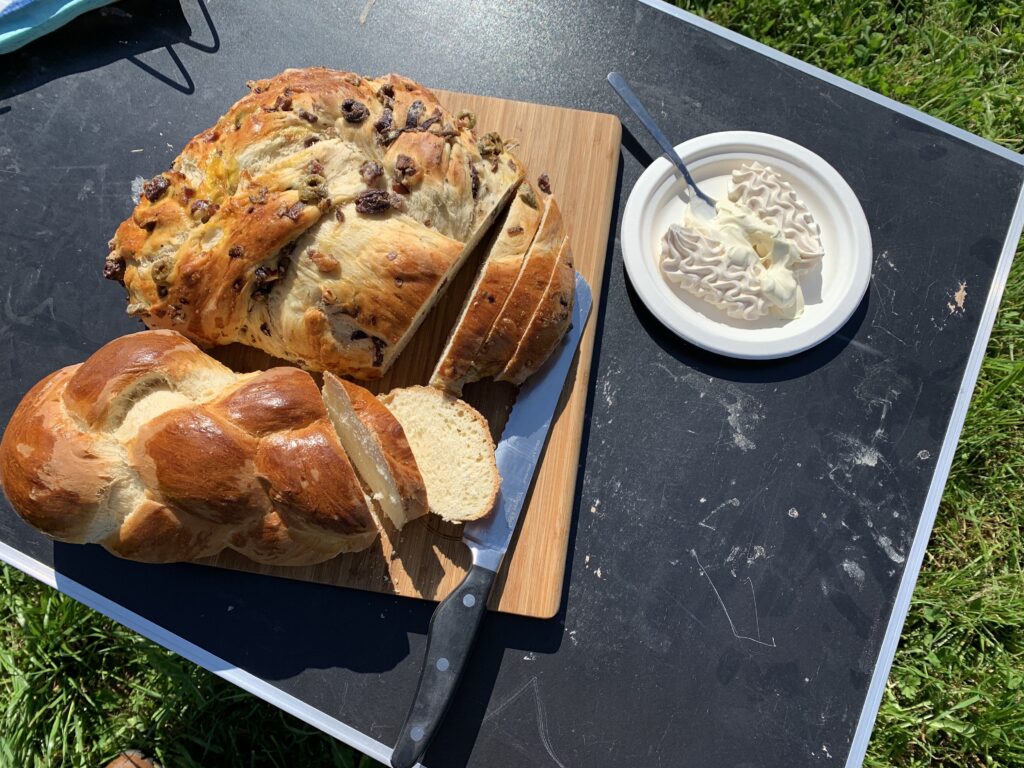 Es war aber auch noch Auffahrt… und das bedeutet traditionell „Hundearbeit“. Leider nicht am Schwarzsee, wie geplant und nur in 4-er Gruppen mit Chef, die Meringues mit Double Crème hatten wir trotzdem. Zu Speck-/Olivenzopf und Mineral..
